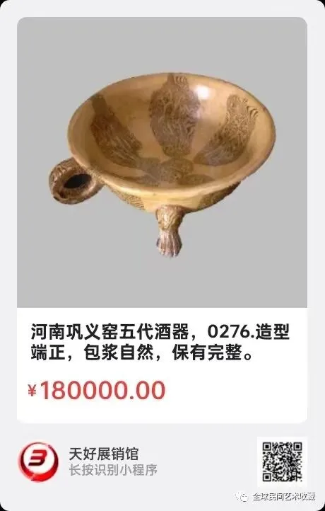 河南巩义窑五代酒器,造型端正,包浆自然,保有完整。尺寸宽9.5厘米,高4.3厘米。已经曹晓宇专家鉴定。来源:0276。