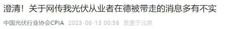 13日凌晨,中国光伏行业协会CPIA微信公众号发文,表示关于网传我光伏从业者在德被带走的消息多有不实,全文如下: