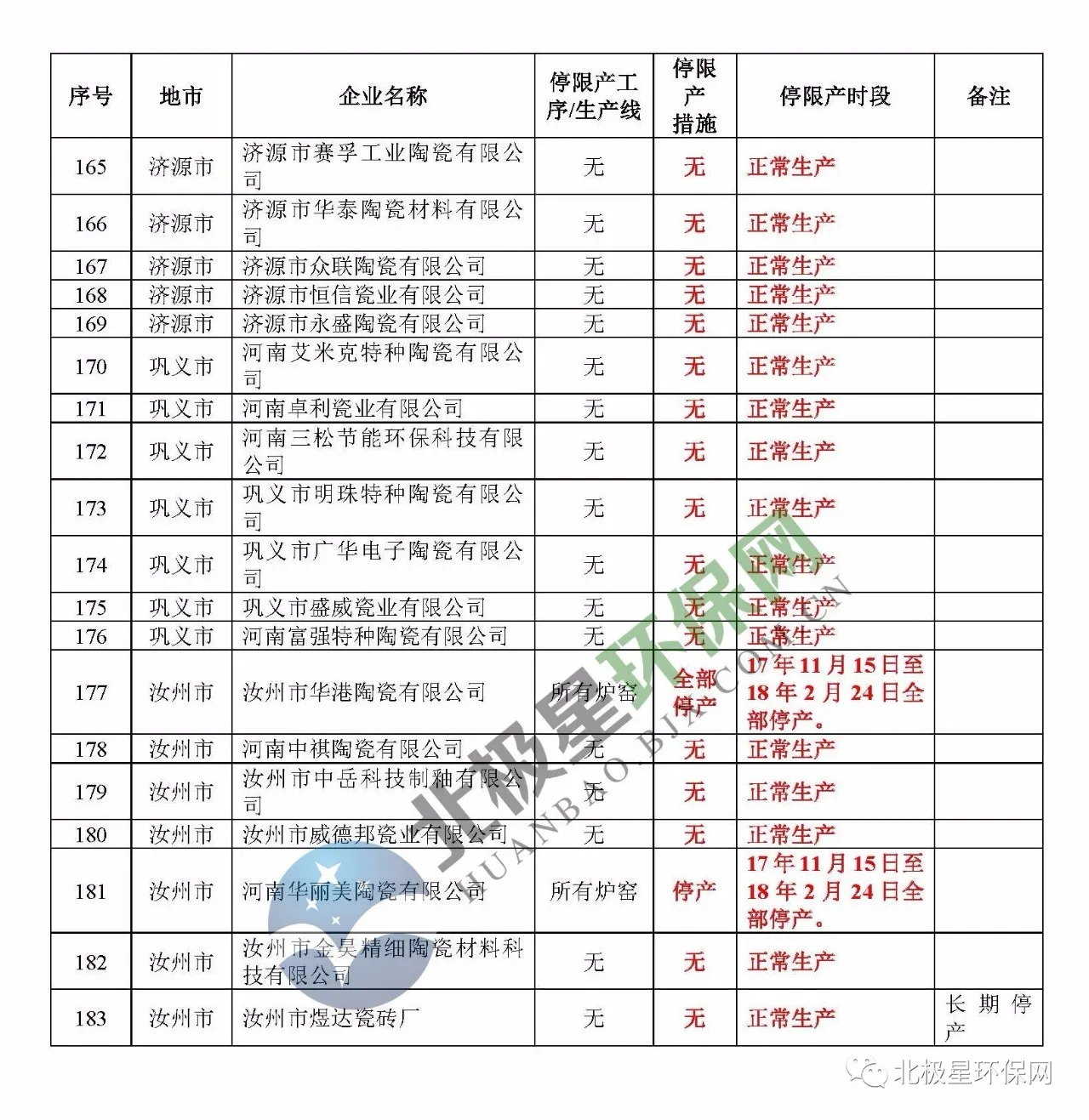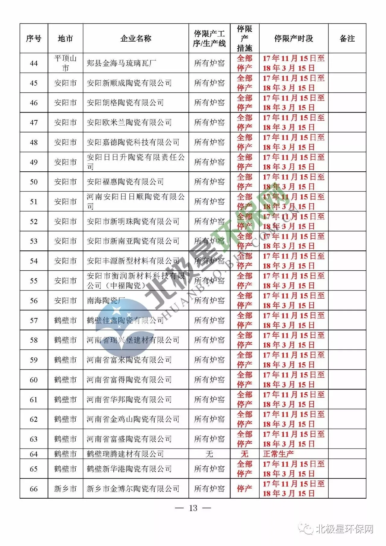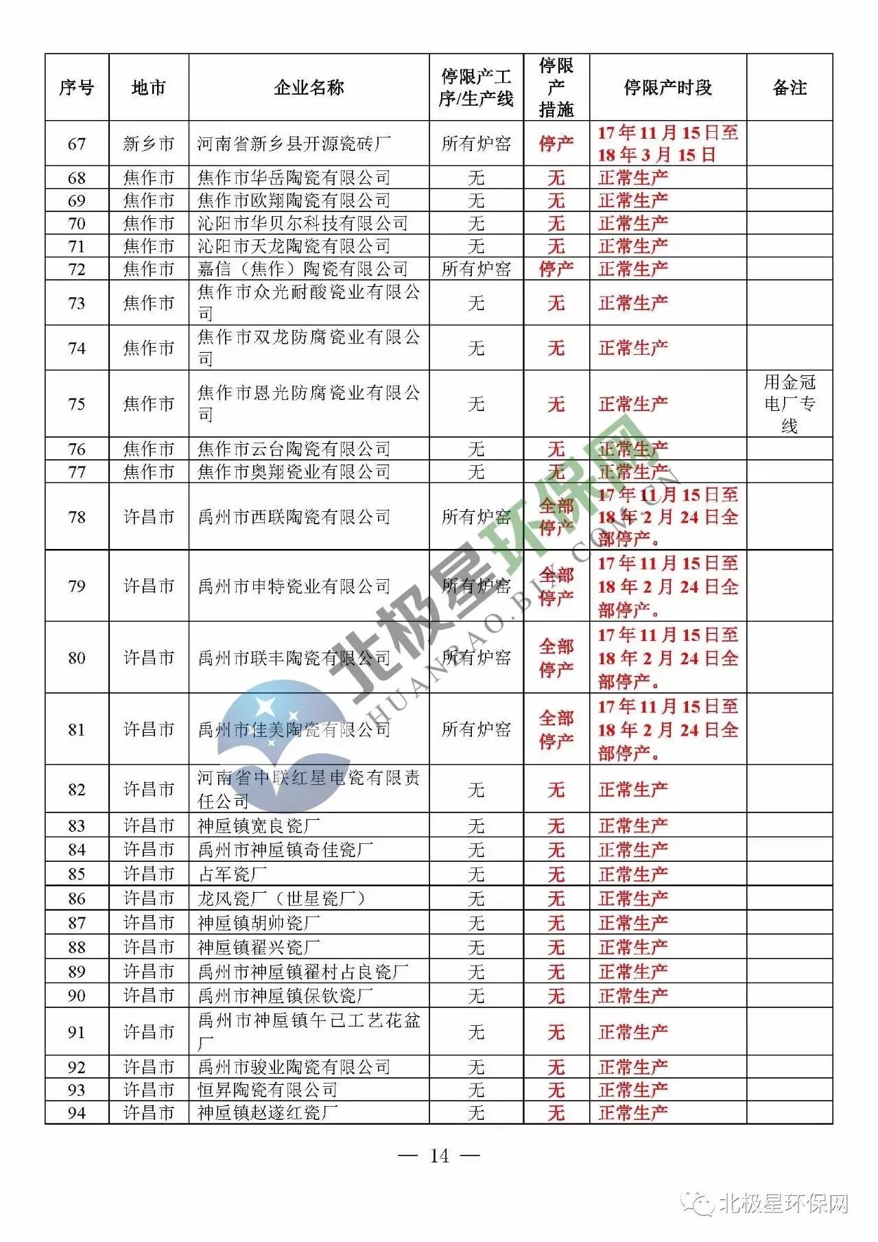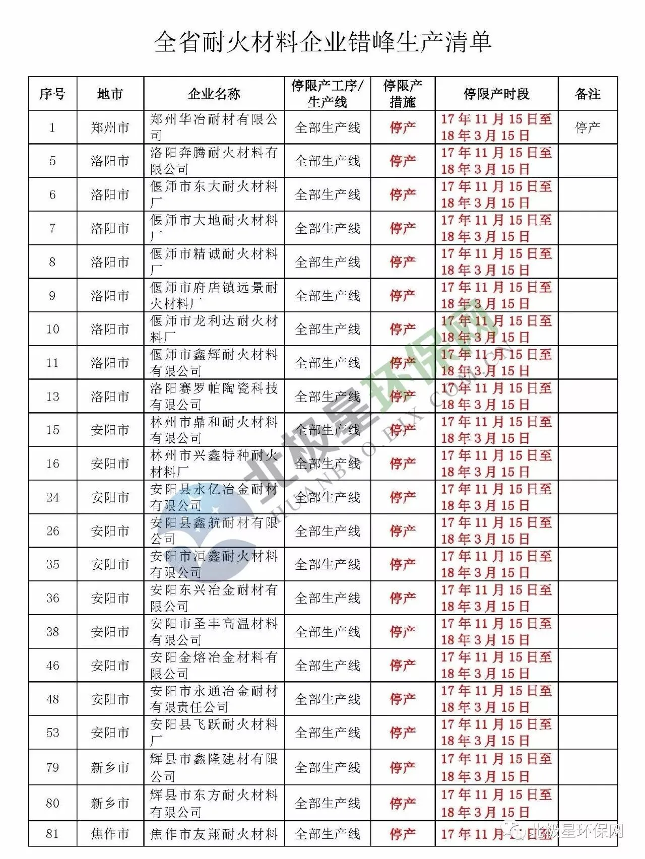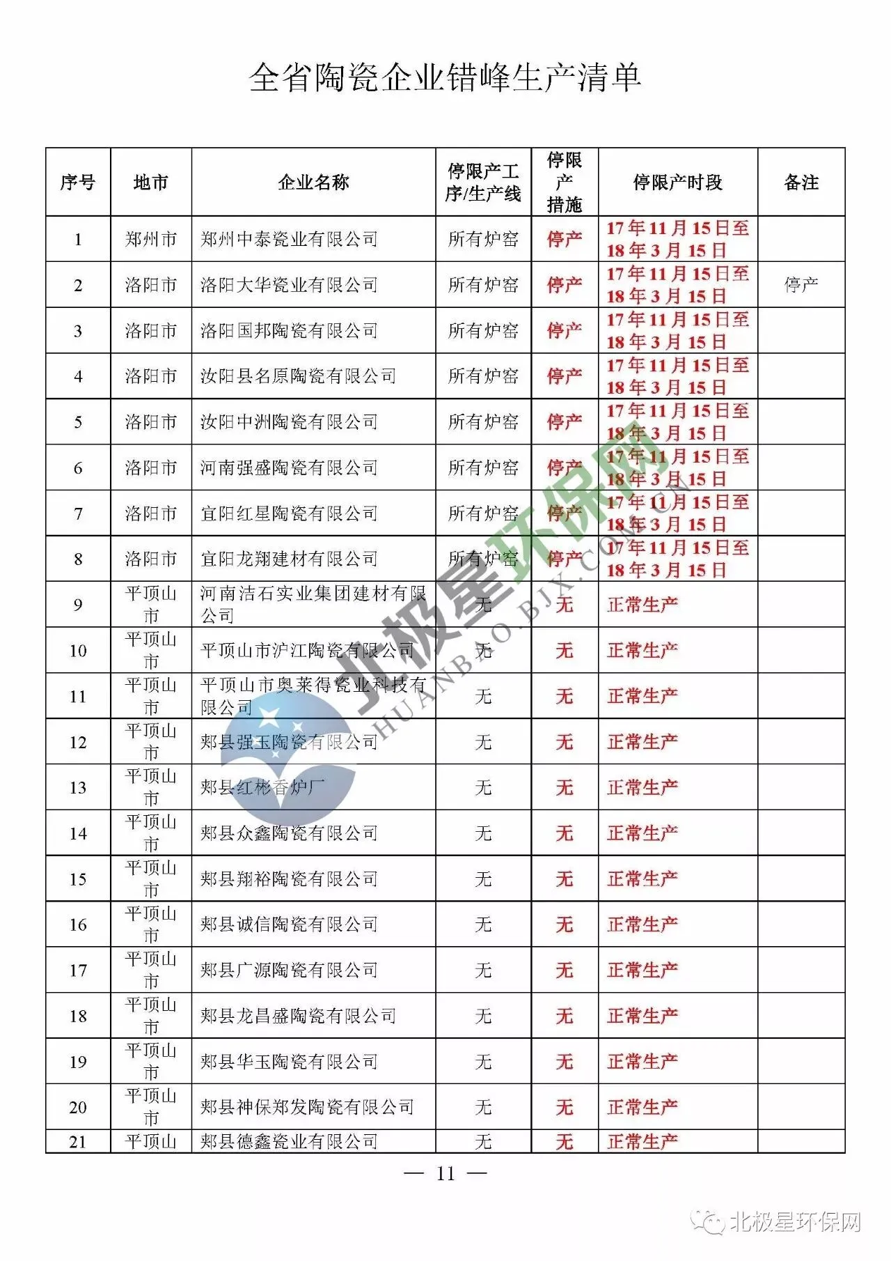 1.郑州市、开封市、安阳市、鹤壁市、新乡市、焦作市、濮阳市、巩义市、兰考县、滑县、长垣县等京津冀大气污染传输通道城市和洛阳市、平顶山市行政区域内的50家水泥、545家砖瓦窑、47家陶瓷、2家岩棉、6家石膏板、23家耐材企业,2017年11月15日至2018年3月15日,全部停产。
