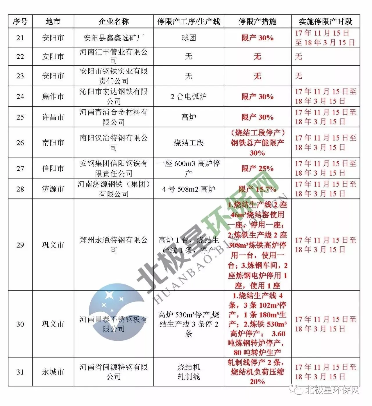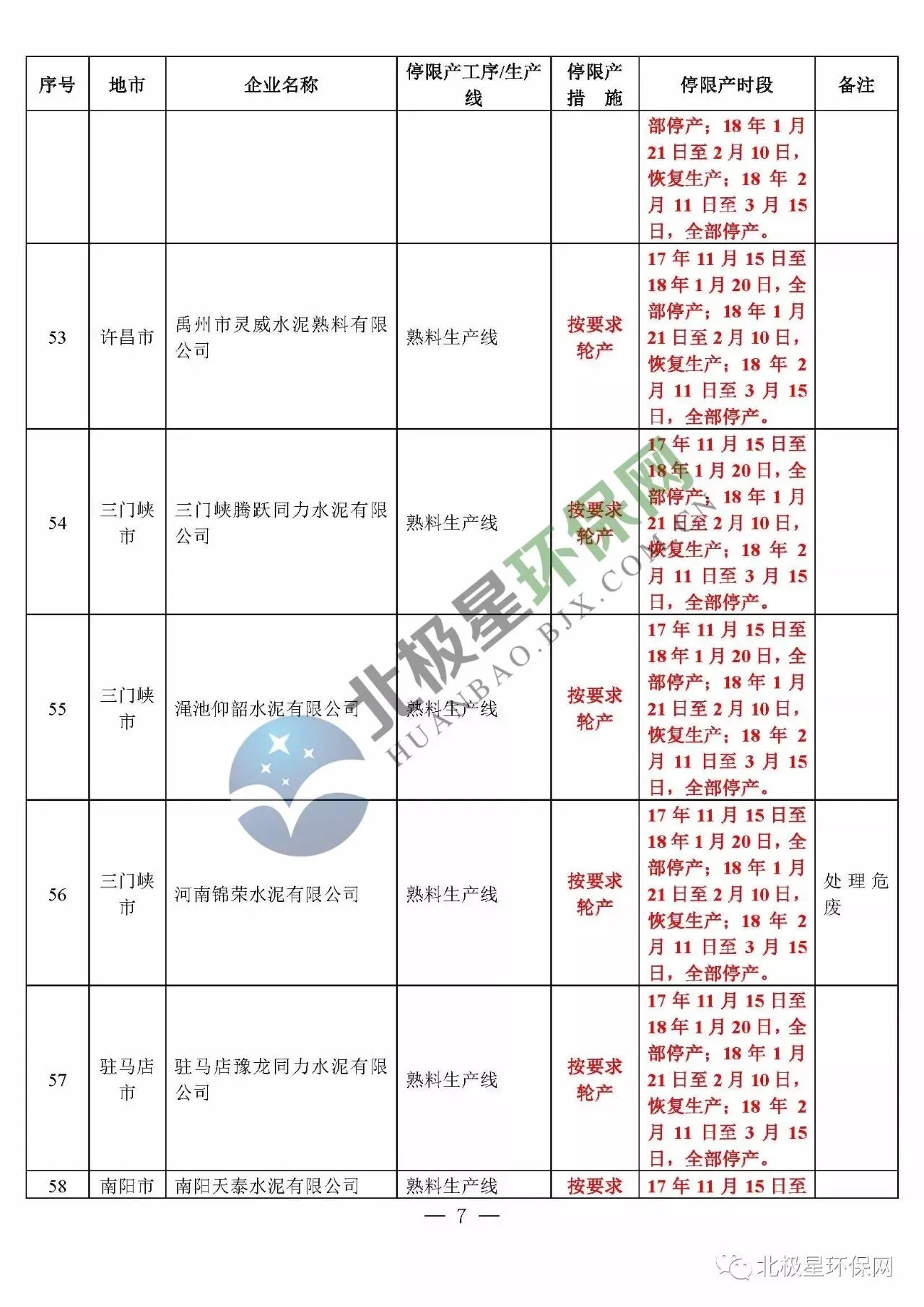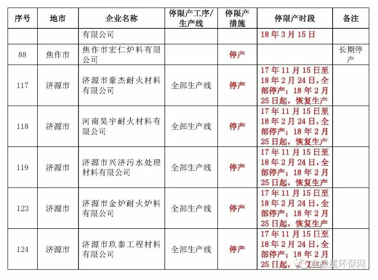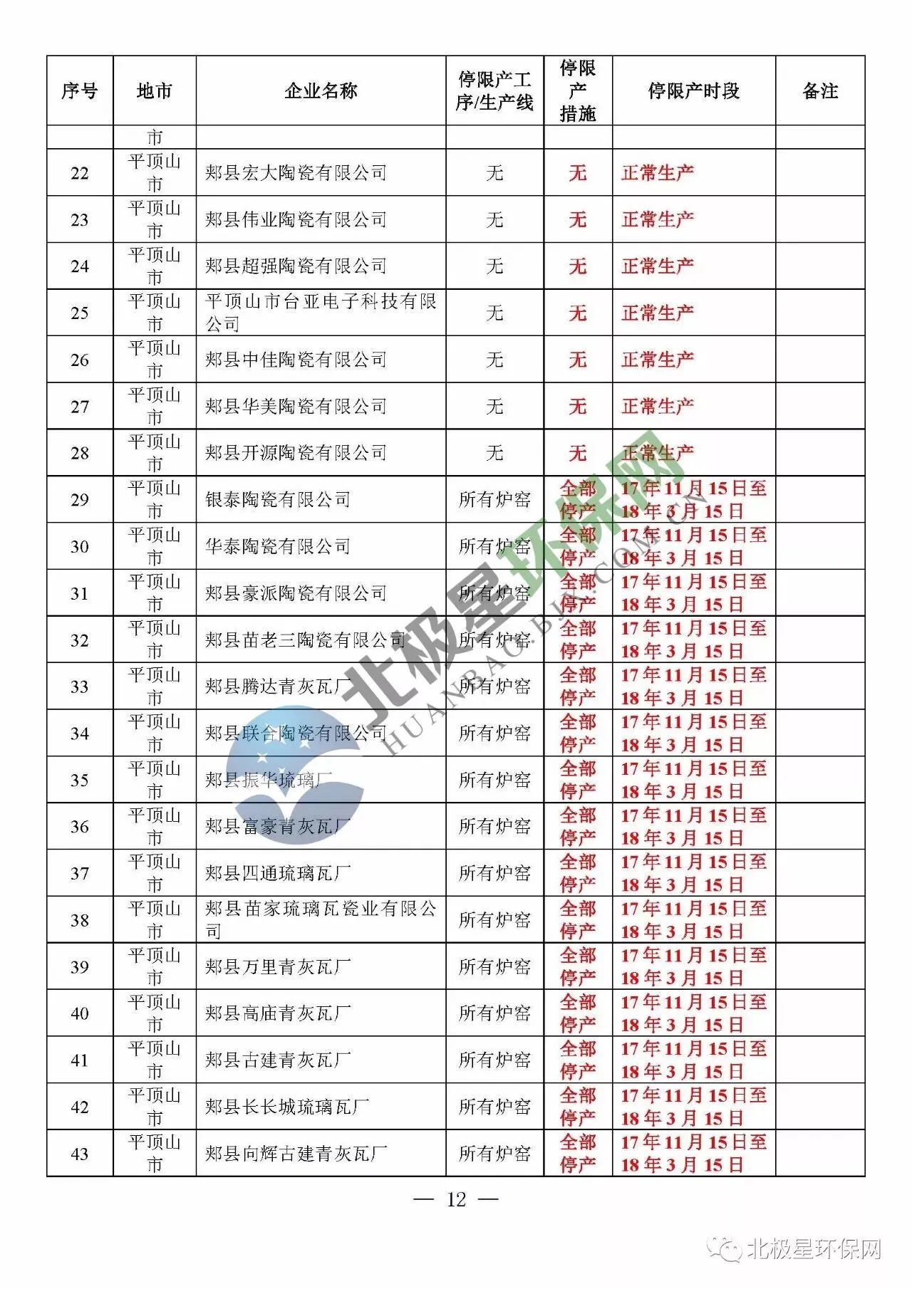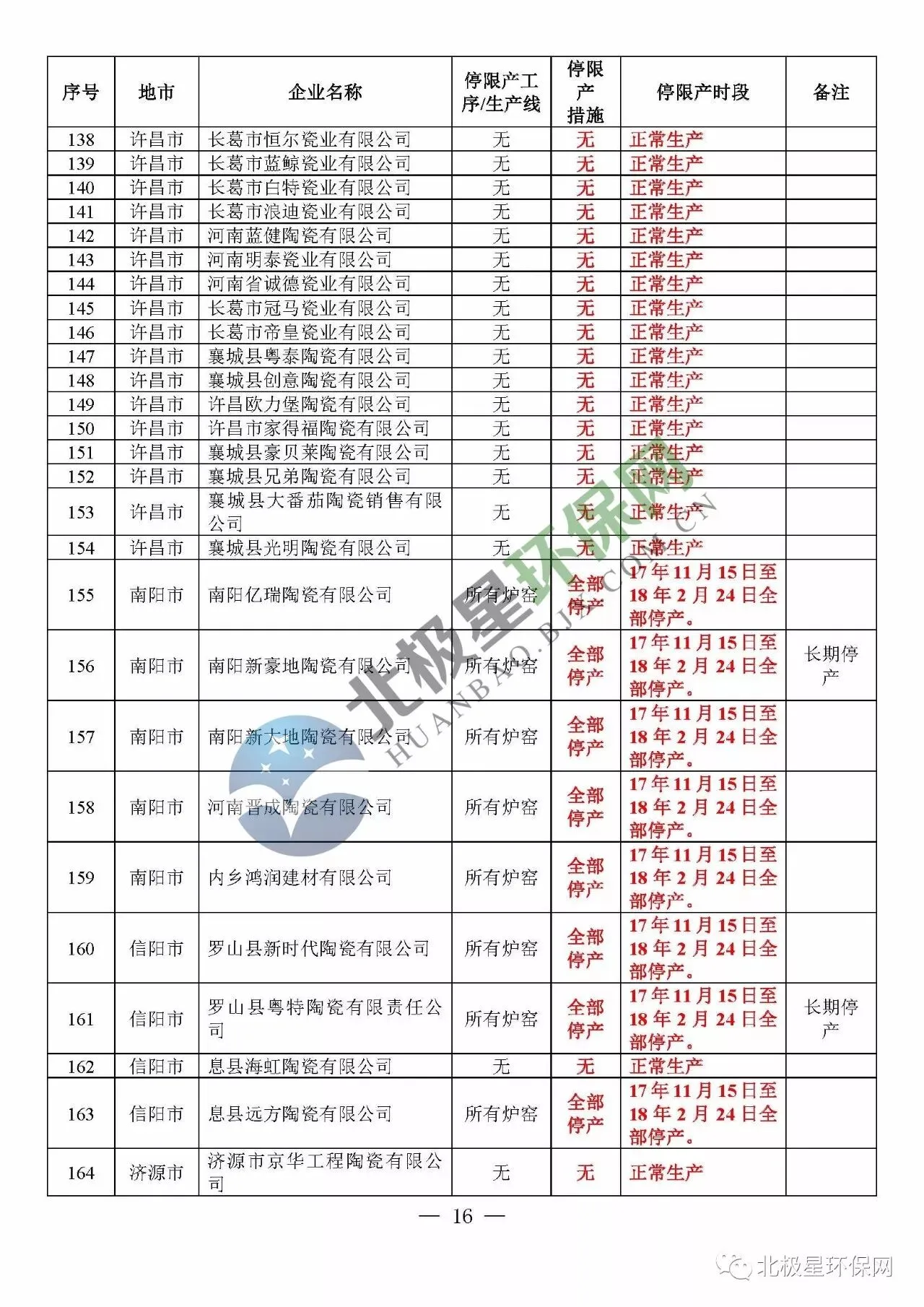 1.郑州市、开封市、安阳市、鹤壁市、新乡市、焦作市、濮阳市、巩义市、兰考县、滑县、长垣县等京津冀大气污染传输通道城市和洛阳市、平顶山市行政区域内的50家水泥、545家砖瓦窑、47家陶瓷、2家岩棉、6家石膏板、23家耐材企业,2017年11月15日至2018年3月15日,全部停产。