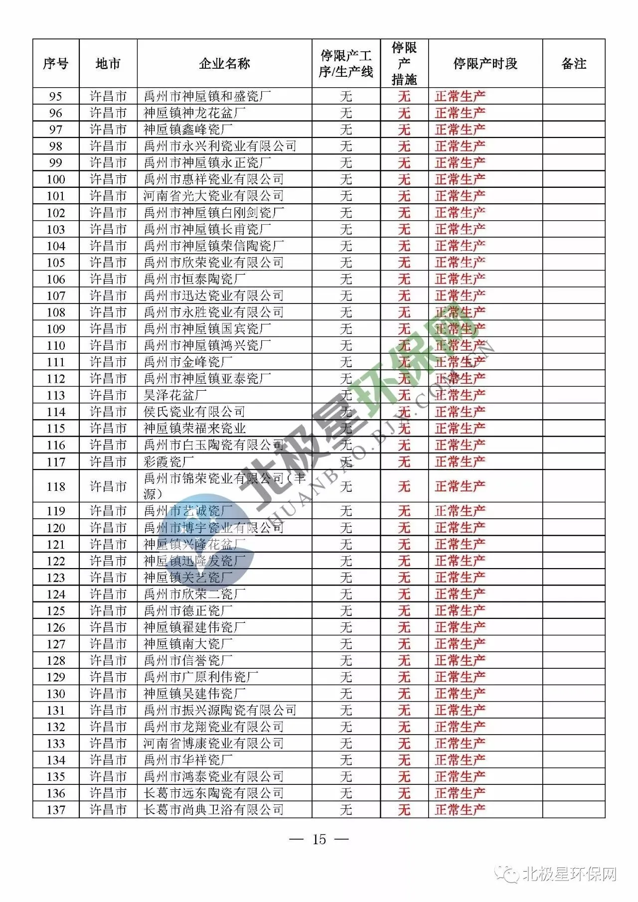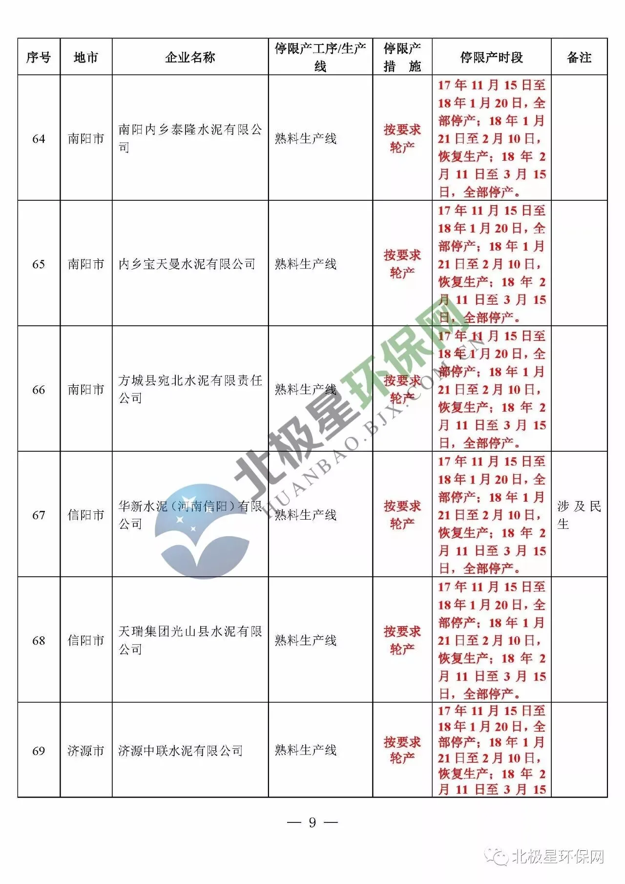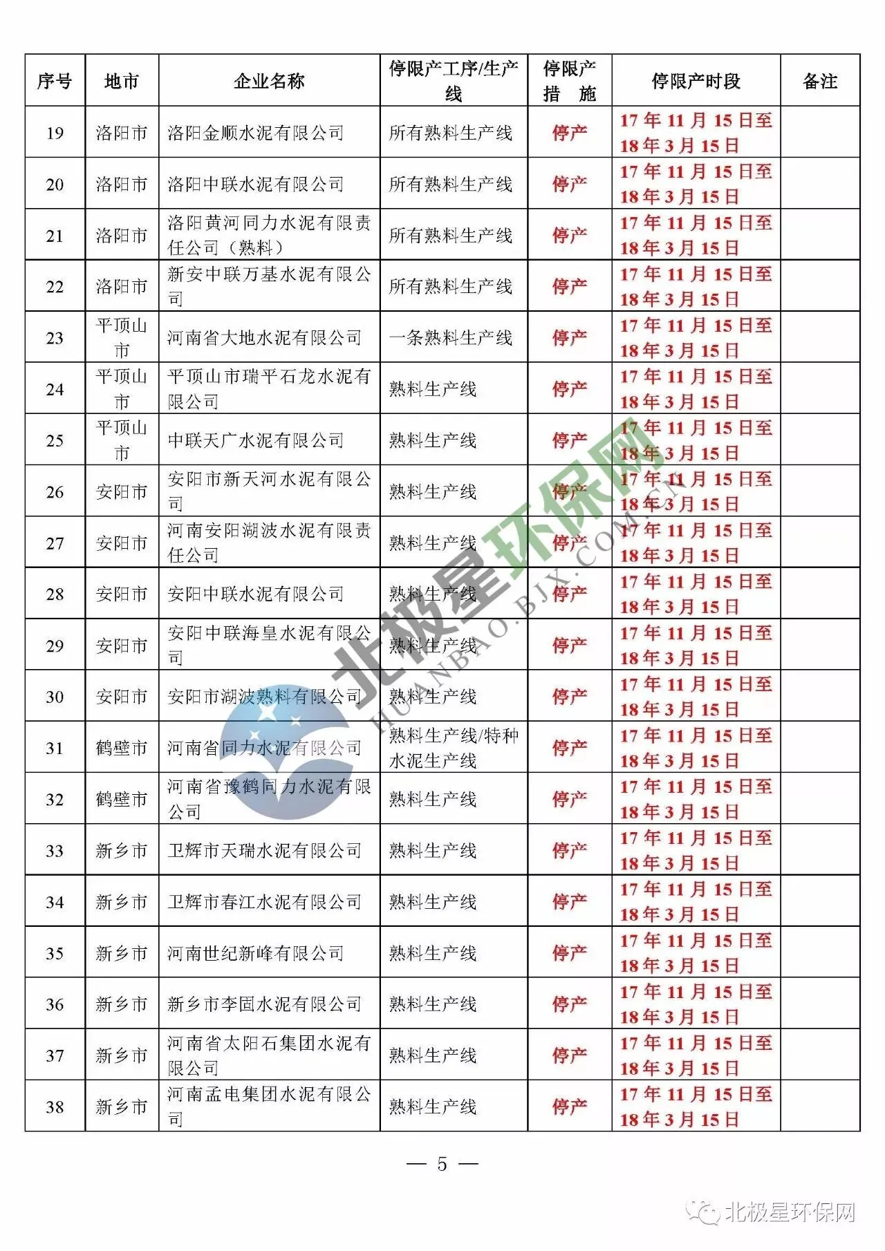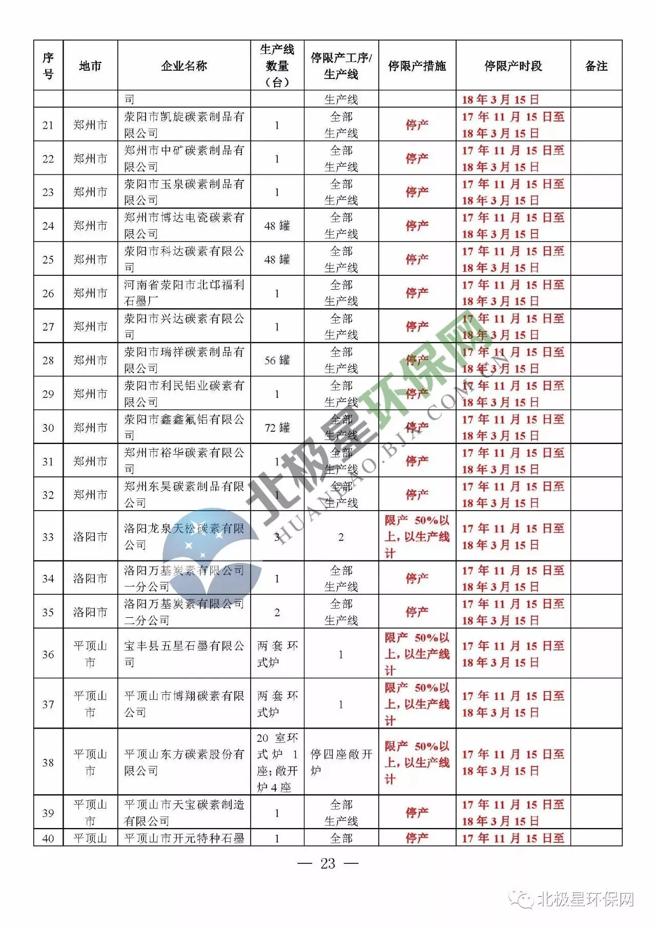 1.郑州市、开封市、安阳市、鹤壁市、新乡市、焦作市、濮阳市、巩义市、兰考县、滑县、长垣县等京津冀大气污染传输通道城市和洛阳市、平顶山市行政区域内的50家水泥、545家砖瓦窑、47家陶瓷、2家岩棉、6家石膏板、23家耐材企业,2017年11月15日至2018年3月15日,全部停产。