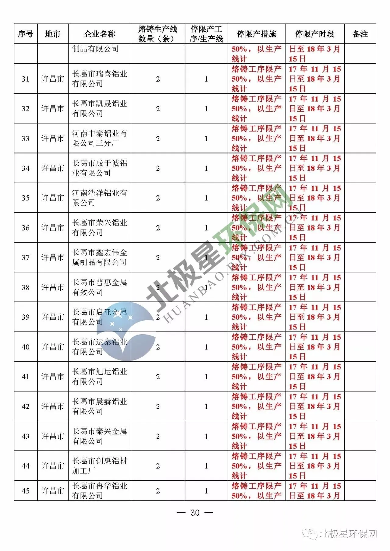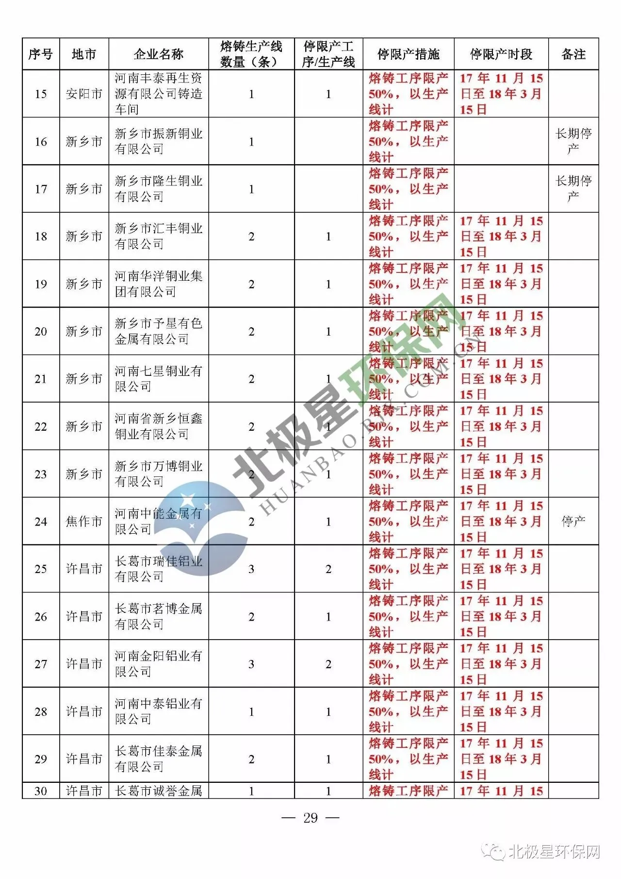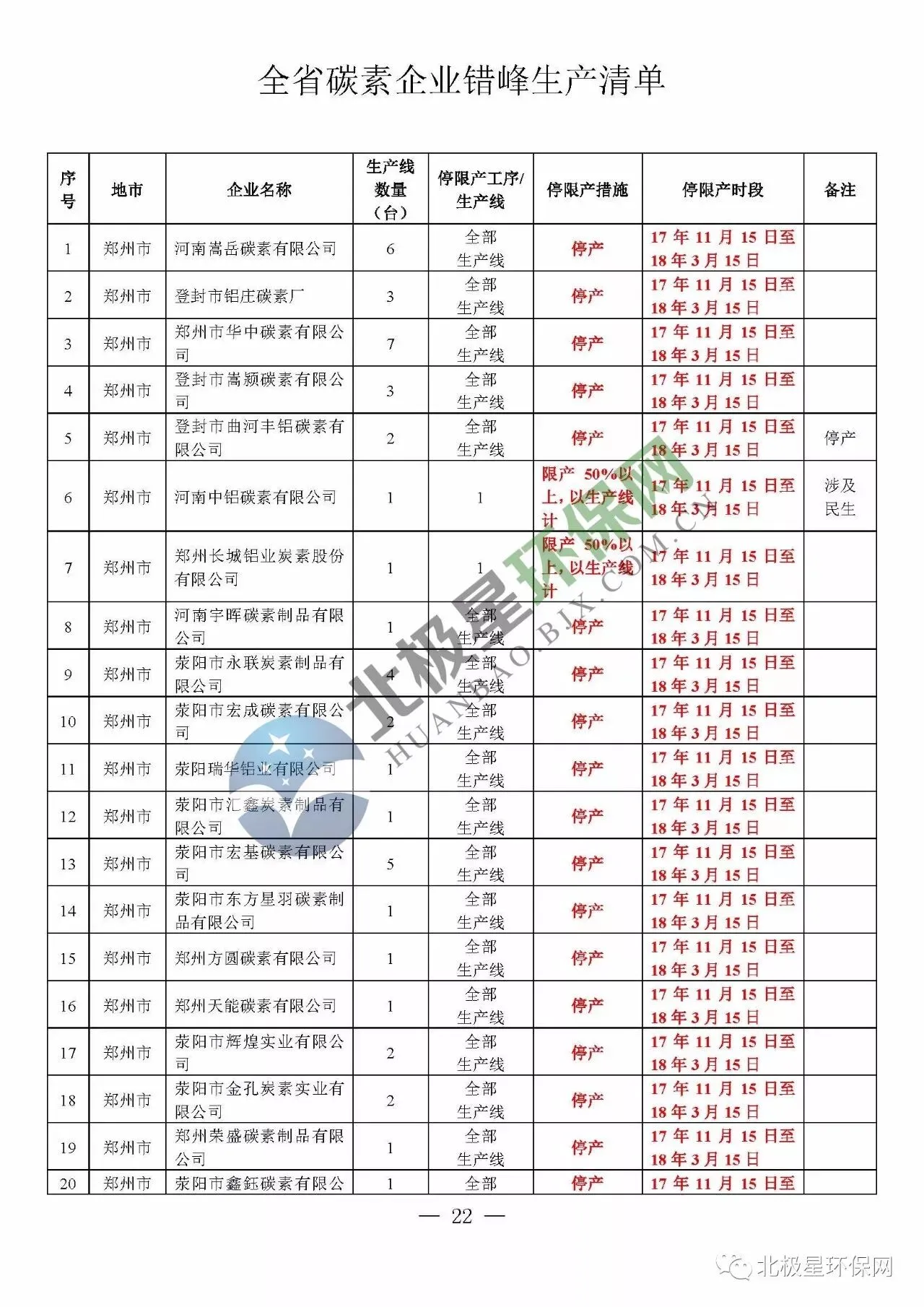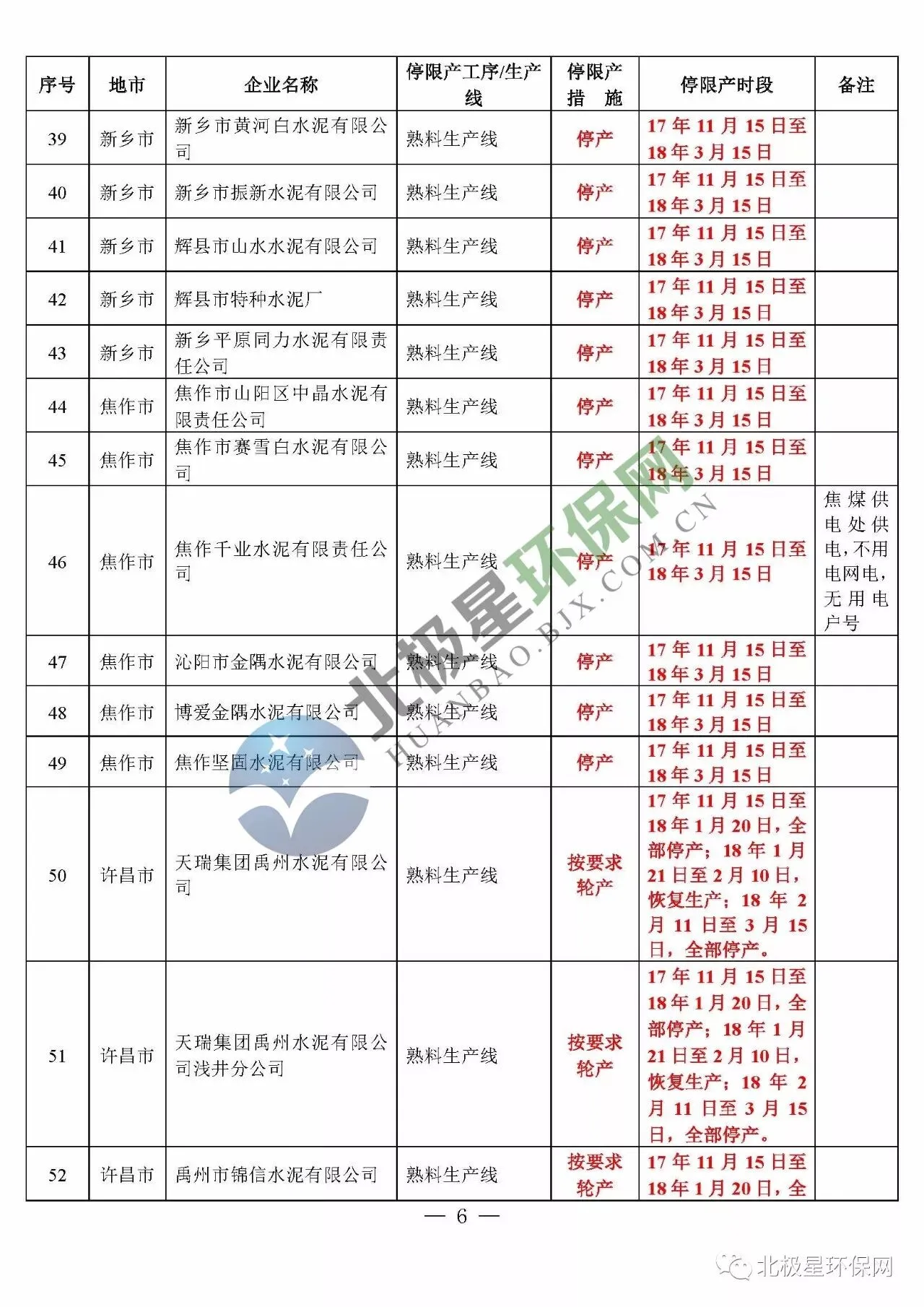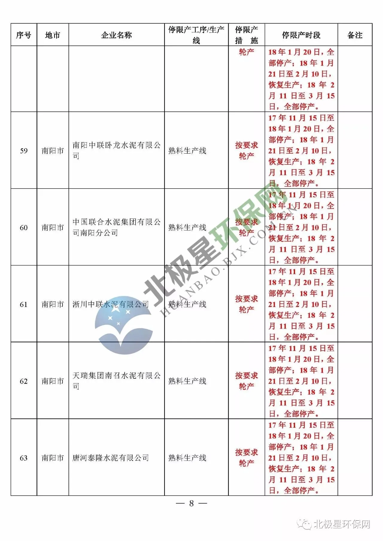 1.郑州市、开封市、安阳市、鹤壁市、新乡市、焦作市、濮阳市、巩义市、兰考县、滑县、长垣县等京津冀大气污染传输通道城市和洛阳市、平顶山市行政区域内的50家水泥、545家砖瓦窑、47家陶瓷、2家岩棉、6家石膏板、23家耐材企业,2017年11月15日至2018年3月15日,全部停产。
