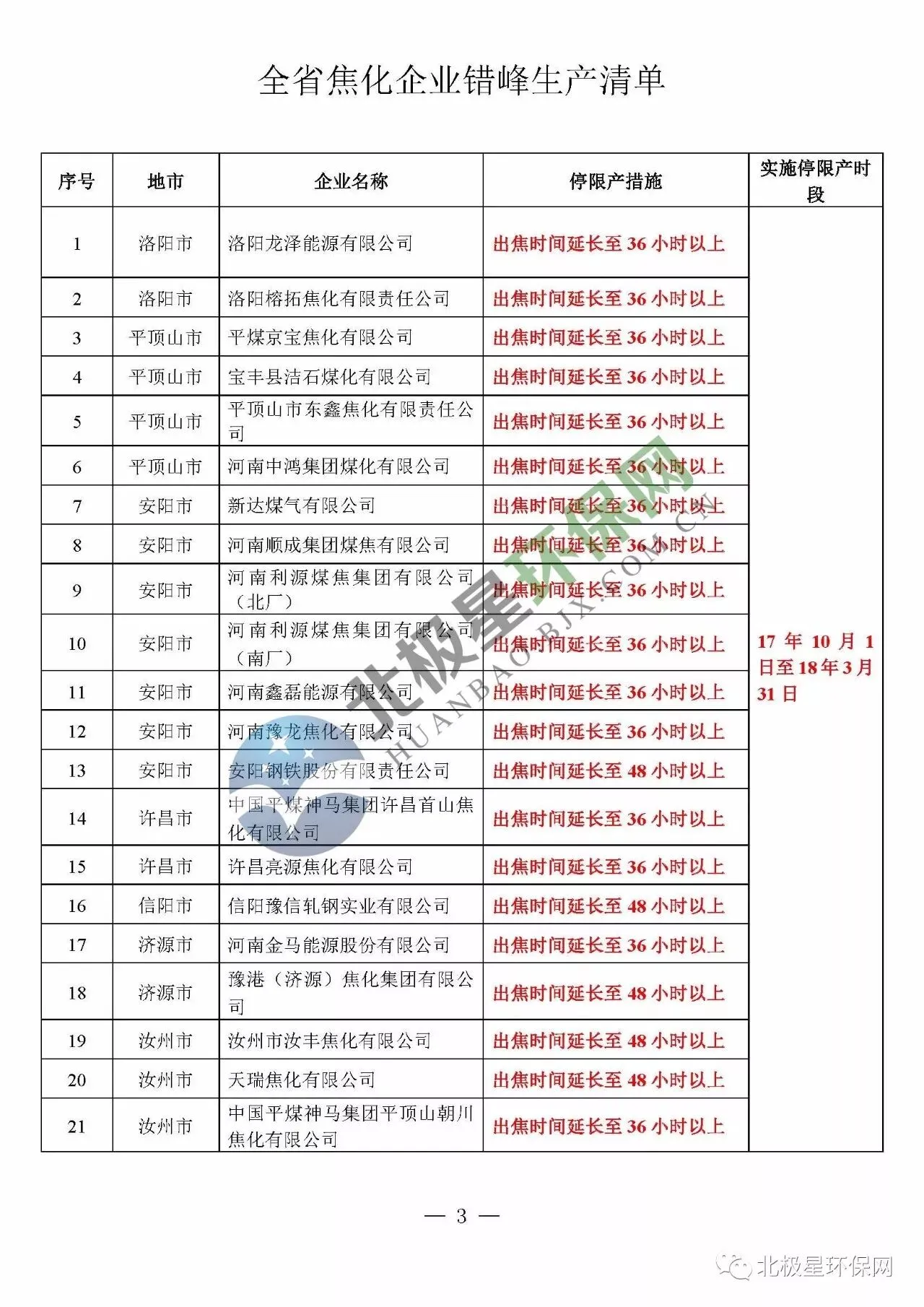 错峰要求:在确保安全的前提下,2017年10月1日至2018年3月31日,郑州市、开封市、安阳市、鹤壁市、新乡市、焦作市、濮阳市、巩义市、兰考县、滑县、长垣县等京津冀大气污染传输通道城市和洛阳市、平顶山市位于城市建成区的1家焦化企业出焦时间延长至48小时以上,其余12家焦化企业出焦时间延长至36小时以上,采用企业实际出焦量核实;2017年11月15日至2018年3月15日,其余省辖市、省直管县(市)位于城市建成区的4家焦化企业出焦时间延长至48小时以上,其余4家焦化企业出焦时间延长至36小时以上,采用企业实际出焦量核实。具体限产情况见附件。