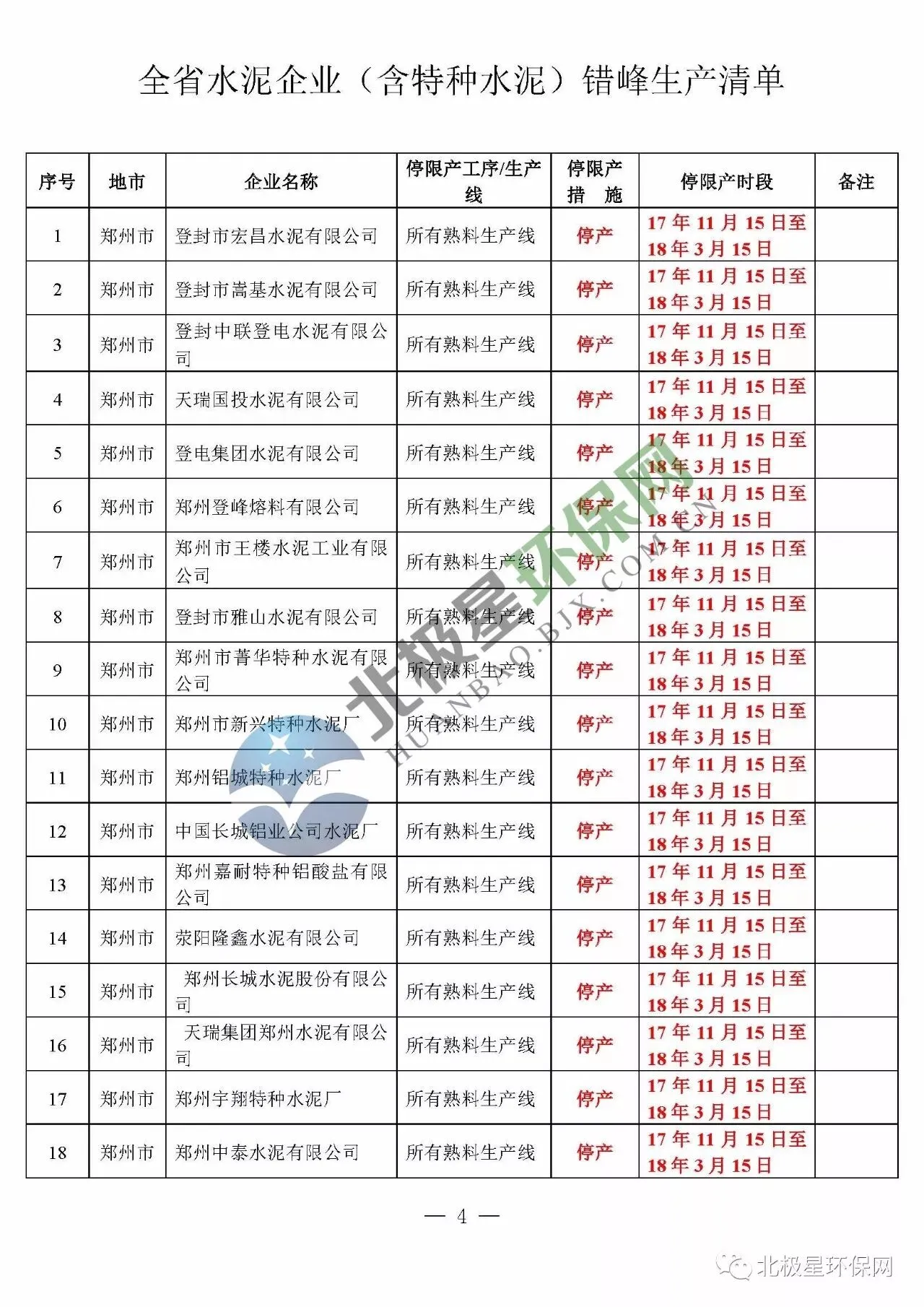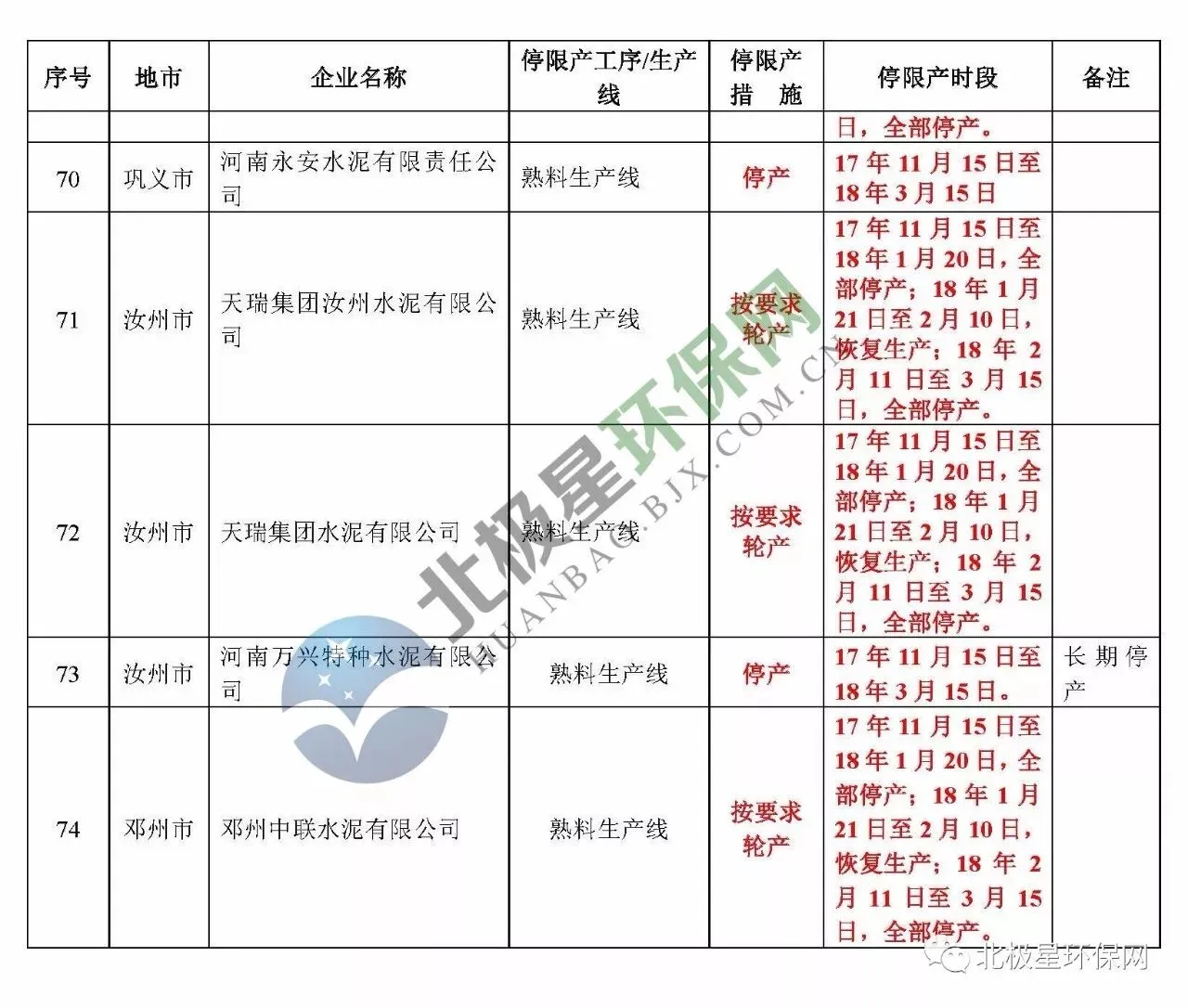 2.其余省辖市、省直管县(市)行政区域内的24家水泥企业,2017年11月15日至2018年1月20日,全部停产;2018年1月21日至2月10日,恢复生产;2018年2月11日至3月15日,全部停产。