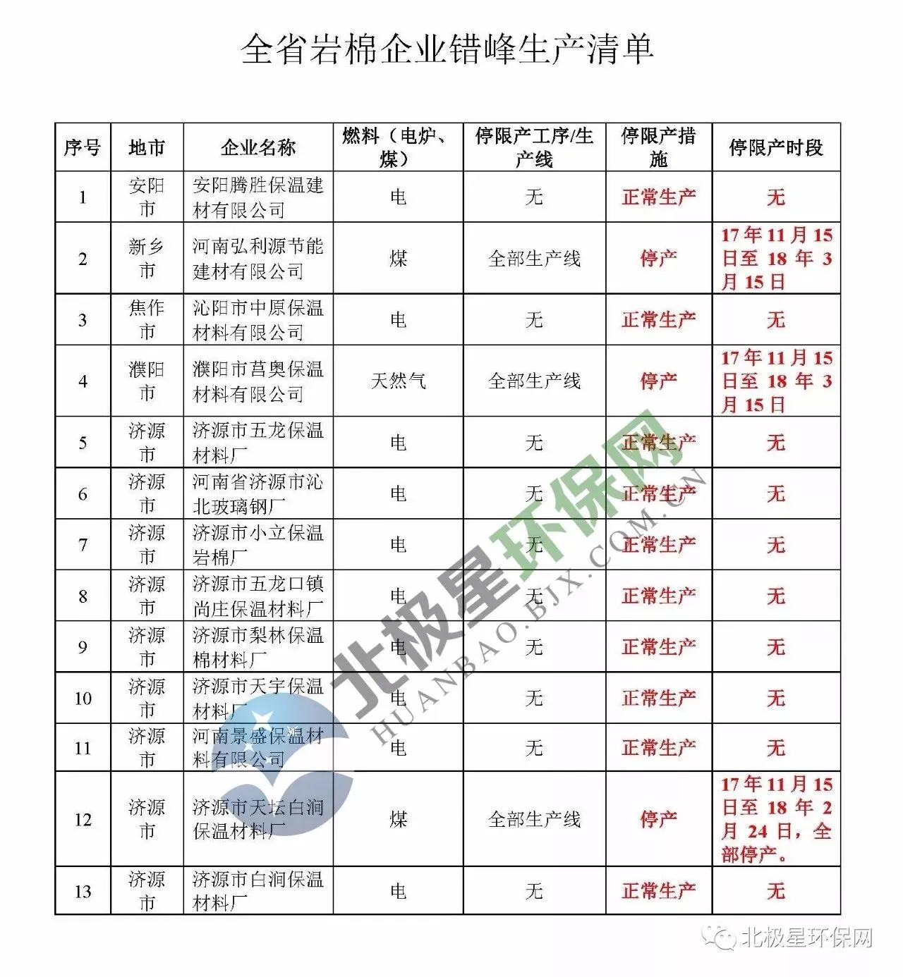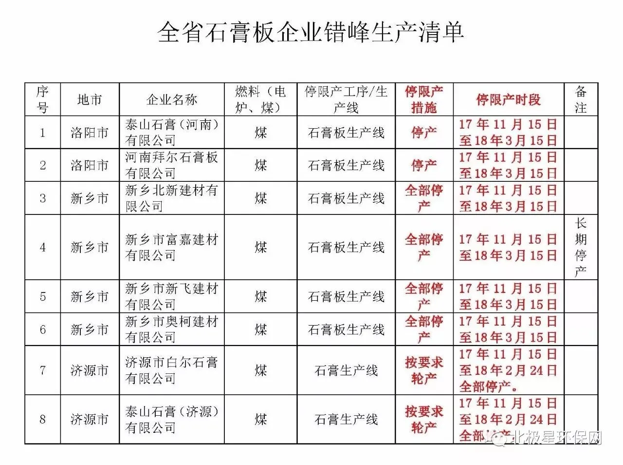 错峰要求:承担居民供暖、协同处置城市垃圾或危险废物等保民生任务的建材企业,拟不纳入错峰生产范围的,要根据承担任务量核定最大允许生产负荷,于2017年9月30日前报省辖市、省直管县(市)政府批准,并报省环境攻坚办备案。具体停产情况见附件。