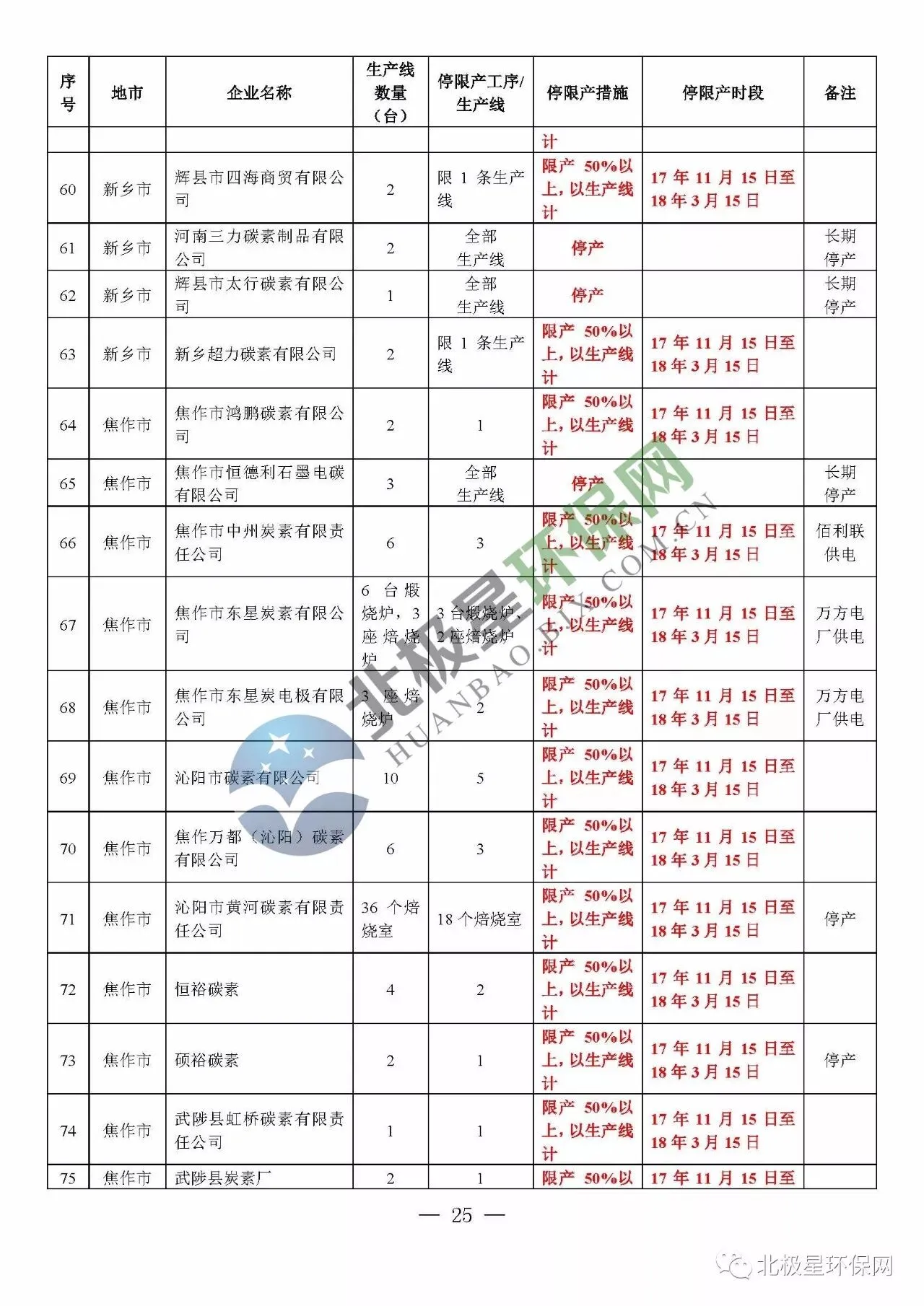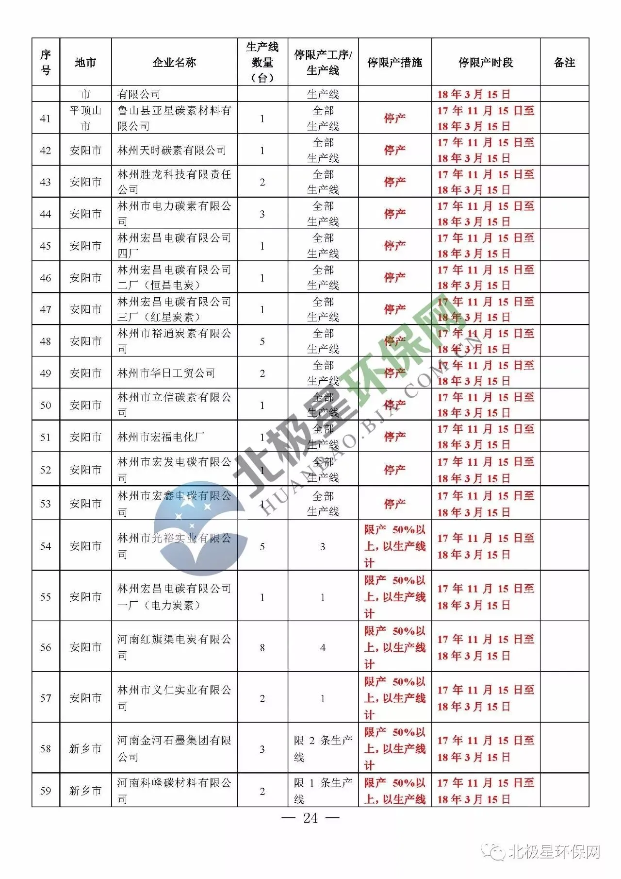 3. 2017年10月31日前,各省辖市、省直管县(市)要组织对111家炭素企业逐家排查验收,对能够稳定达到《铝工业污染物排放标准(GB25465-2010)》修改单特别排放限值要求的炭素企业,限产50%以上,以生产线计,采取现场督查抽查核实;对未安装大气污染物在线监测设施、或不能稳定达到特别排放限值要求、或被各级督查发现环境污染问题的炭素企业,一律纳入采暖季停产范围。验收核查情况于11月5日前报省环境攻坚办备案。