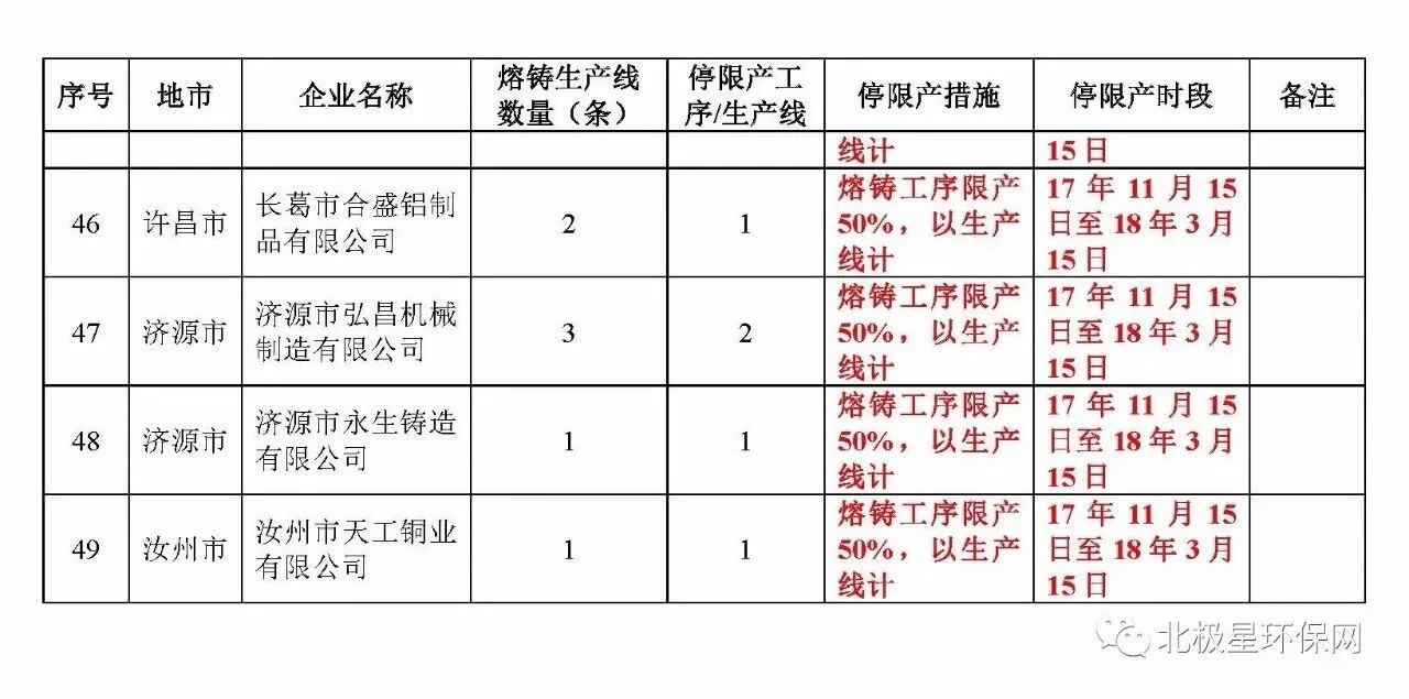 3. 铸造行业:全省99家铸造限产4个月!(2017年11月15日至2018年3月15日)