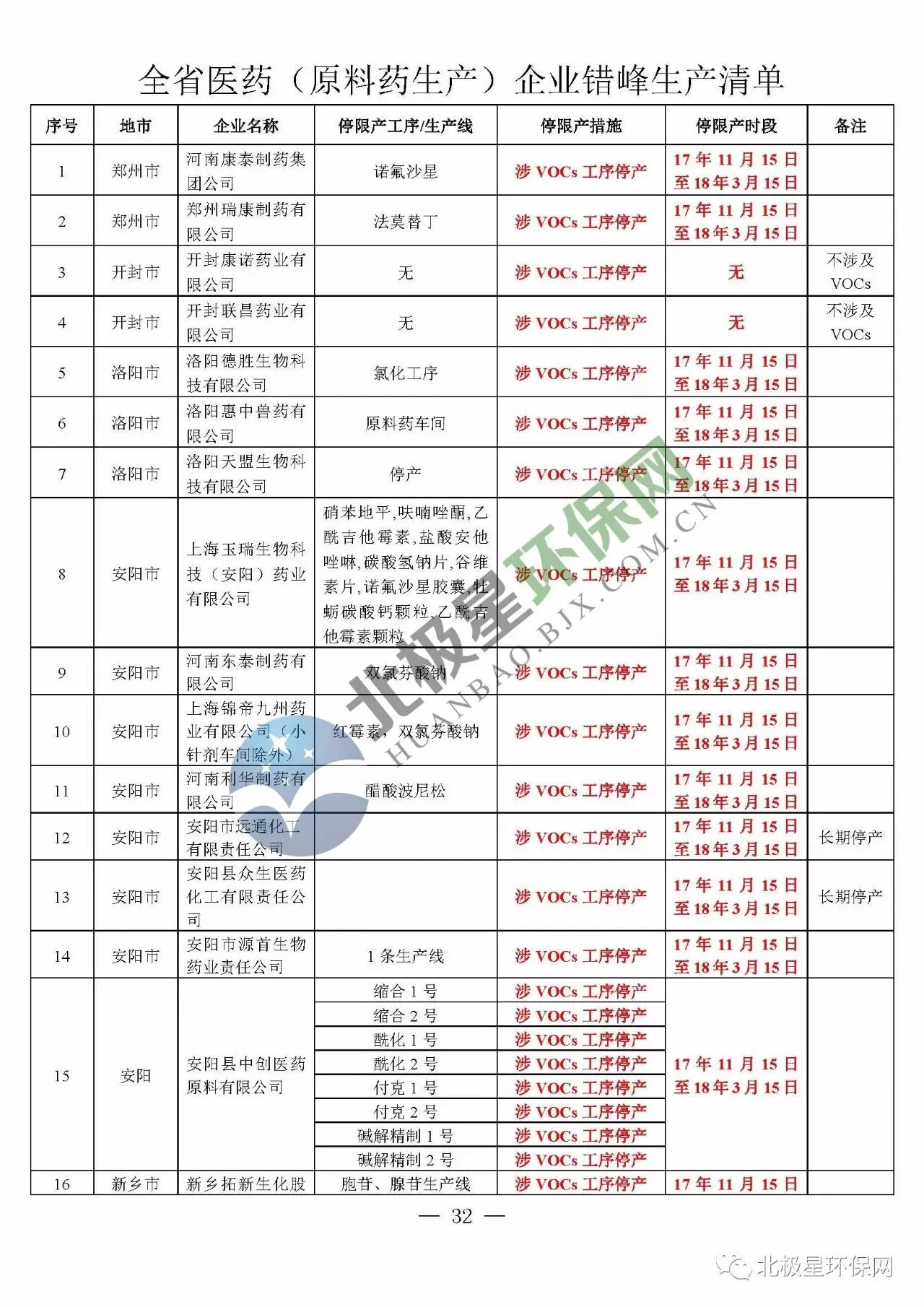 错峰要求:48家原料药生产企业和35家生产过程中使用有机溶剂的农药企业的涉VOCs排放工序,原则上全部实施停产。由于民生等需求存在特殊情况确需生产的,于2017年9月30日前报省人民政府批准。具体停限产情况见附件。