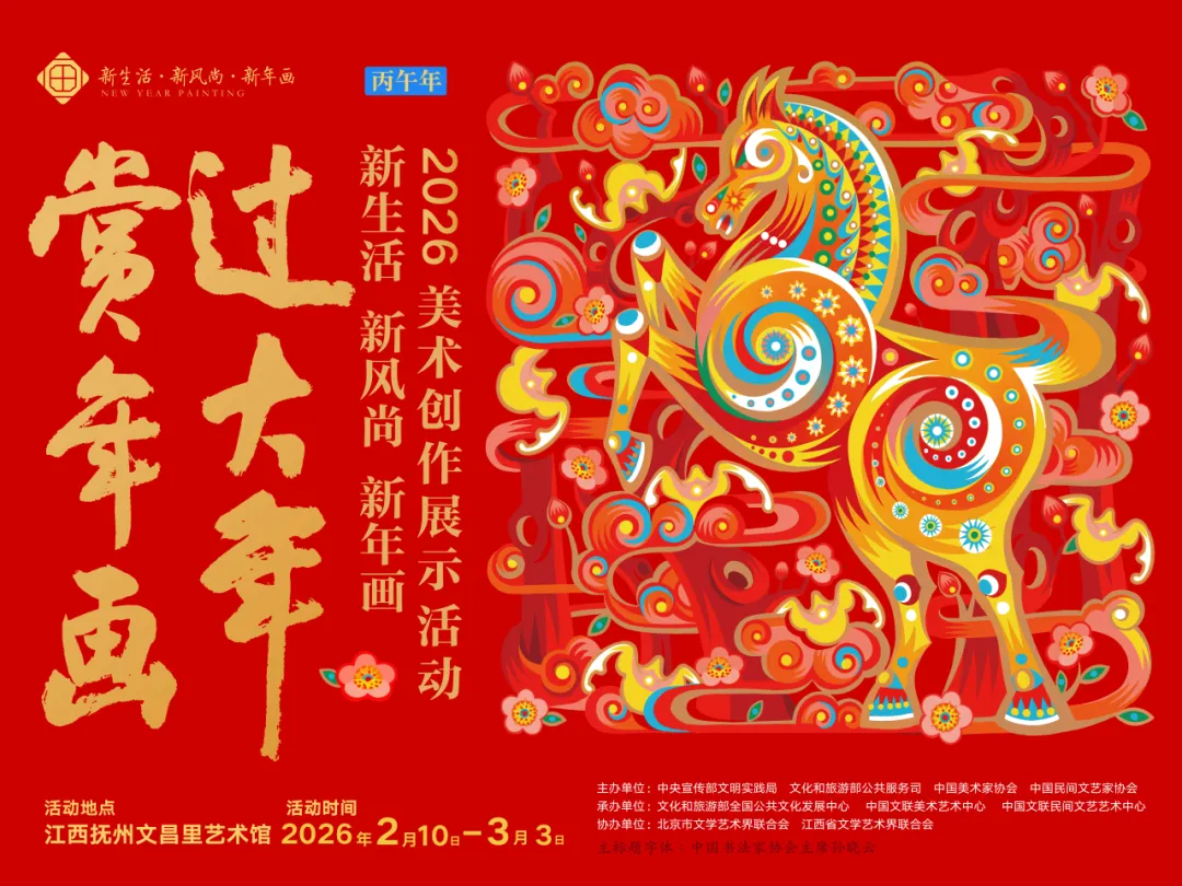 由中央宣传部文明实践局、文化和旅游部公共服务司、中国美术家协会、中国民间文艺家协会主办,文化和旅游部全国公共文化发展中心、中国文联美术艺术中心、中国文联民间文艺艺术中心承办的2026年“新生活·新风尚·新年画”美术作品展在北京市、江西省抚州市开展,展览时间为2月10日—3月3日。活动以习近平新时代中国特色社会主义思想为指导,旨在以年画艺术激活传统节日文化内涵,营造文明祥和的节庆氛围。