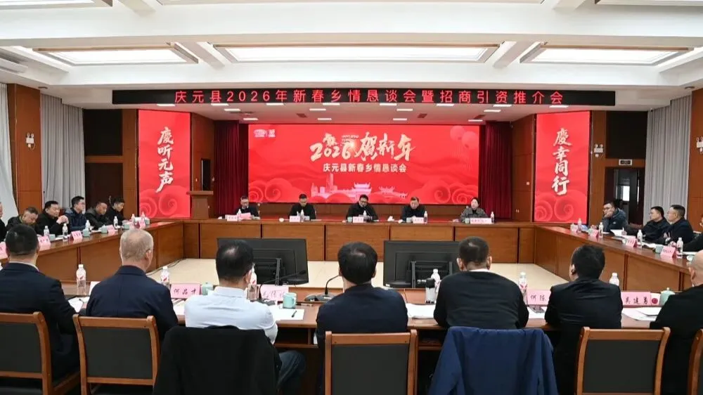 2月19日,我县召开2026年新春乡情恳谈会暨招商引资推介会,郑承烈、毛传福、林海等近20位企业家代表与谭国庆、吴青松、胡显平、孙梦俏、周利民等县领导围坐交流,畅叙桑梓情深,共绘庆元发展蓝图。