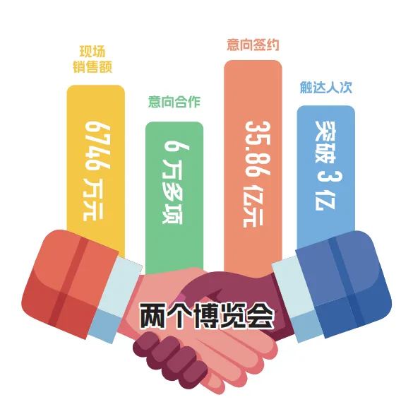 这场国家级盛会,促成6746万元现场销售额、6万多项意向合作、约35.86亿元意向签约金额,通过线下与线上多渠道联动,活动总触达人次突破3亿。强劲的消费数据,直观印证了两个博览会作为高能级平台,在展示成果、促进交易、引领发展上的突出作用。