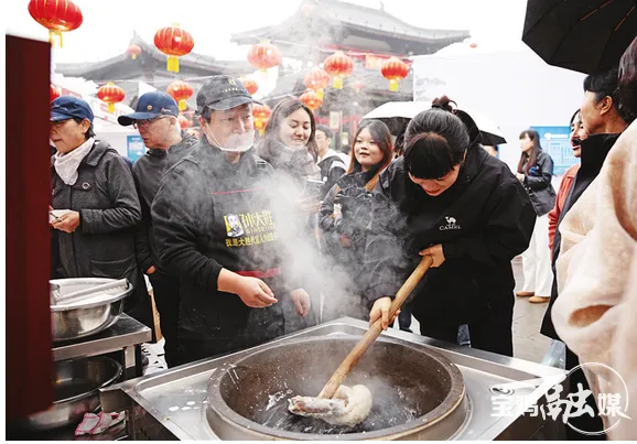 美食街区,游客排队体验擀面皮制作技艺。