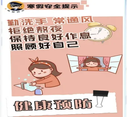 4.健康生活:保持规律作息,合理饮食,不暴饮暴食。注意冬季室内通风,预防一氧化碳中毒(使用燃气热水器,煤炉取暖时尤其注意)