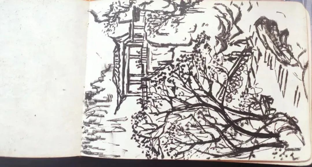本次独家曝光的珍贵手稿,是先生数十年写生的心血:申甘林带的速写、黄河故道的写生、林木创作的草图,没有精雕细琢,却满是灵气。手稿上的批注、修改痕迹,记录着他的创作思路:为了画好一片树叶,反复写生数十次;为了还原故道风沙,一遍遍调试笔墨。朴素的手稿,藏着最纯粹的艺术初心。