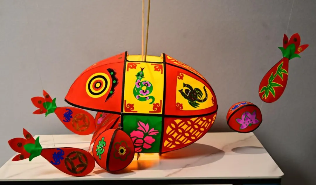 剪纸不仅仅是独立的表现艺术,这种镂空的形式还可以作为装饰,在元宵节的传统灯笼制作中必不可少。元宵节纸灯中最令人着迷的是妇女巧娃扎成的花灯,上面贴有各种剪纸花样,有山水人物花鸟虫鱼,千姿百态。《鱼灯》这幅作品中,五毒、挂钱、花卉恰如其分地打扮其间,增强了花灯的美感更展现出了艺术形象的表现力。