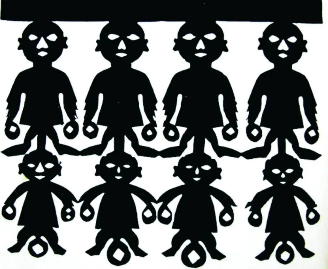 “燎疳娃娃”是独具庆阳民俗特色的剪纸。“疳”是一种病魔,用于燎疳治病、驱邪消灾的纸人叫“燎疳娃娃”或“疳娃娃”。正月二十一,家家用黄表纸剪成二方连续、四方连续的一串串“疳娃娃”贴在门楣上,上边再放一把麦草,这叫“引疳”。正月二十三晚上,家家门口点起火堆,将纸人和谷草投到火里,纸人入火转为神灵,全家人再从火堆上跨过,有驱逐瘟疫,保佑全家人丁兴旺和丰收平安的寓意,此为“送疳”。燎疳一过,陇东人的“年”就过完了。