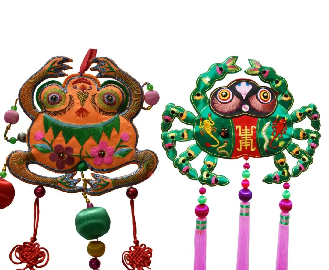 对蛙的崇拜,广泛存在于庆阳民间信仰中,小儿的肚兜、扎花的童鞋,帽子背心上,窗花绣枕上都常见到蟾蜍青蛙。尤其是端午节,庆阳小孩的背上都会背着一个绣有青蛙或蟾蜍的大香包,寄寓着平安、护生、辟邪的心愿。