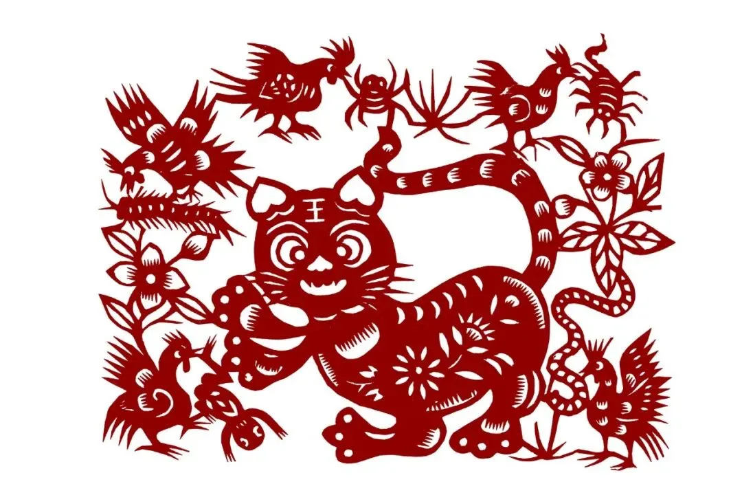 在庆阳,端午节都会给孩子佩戴一个金鸡大香包,庇护子女,身体健康。鸡能除五毒,可避邪毒,防鬼怪、祛病害。剪纸艺人常说:“鸡,猫逮哩。” 猫调皮可爱,画面以猫为中心,边绕五只形态各异衔着五毒的大公鸡,并巧妙地以花草相连。整幅画面生动活泼,极具动感。