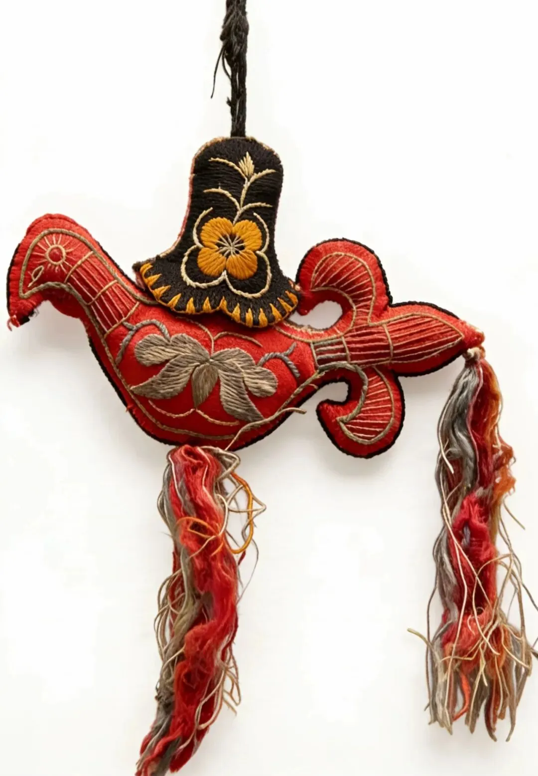 针扎,为旧时妇女存放绣花针、缝衣针的微型用具,分为下部内芯和上部外罩两部分,内芯填充了棉花可扎针,罩上外套,方便安全。针扎形式多样,此为鸡绣花针扎,鸡尾变“云勾子”,云勾在民间美术中为生命和阳性的符号。鸡身绣莲花,鸡喻阳喻男,莲花喻阴喻女,暗喻男女和合,多子多福之意。