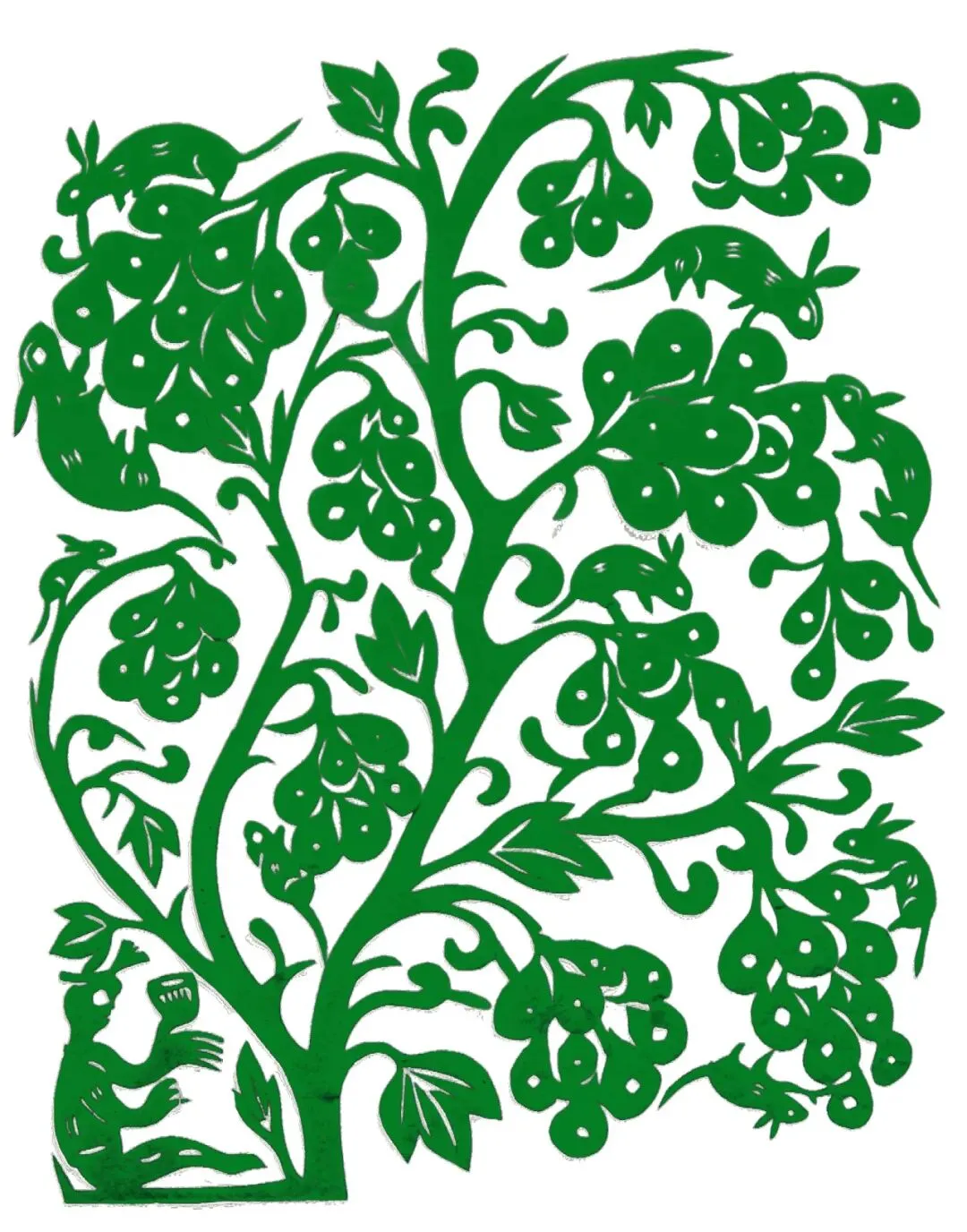 彭粉女在阐释这幅作品时说:“在七夕节这天,人们偷偷地藏在葡萄藤下,听天上的仙女在说话。”老鼠与葡萄组合,寓意多子丰登,民间视鼠为子神,善育多产,葡萄枝蔓绵延、果实累累,象征家族兴旺、绵延不绝。
