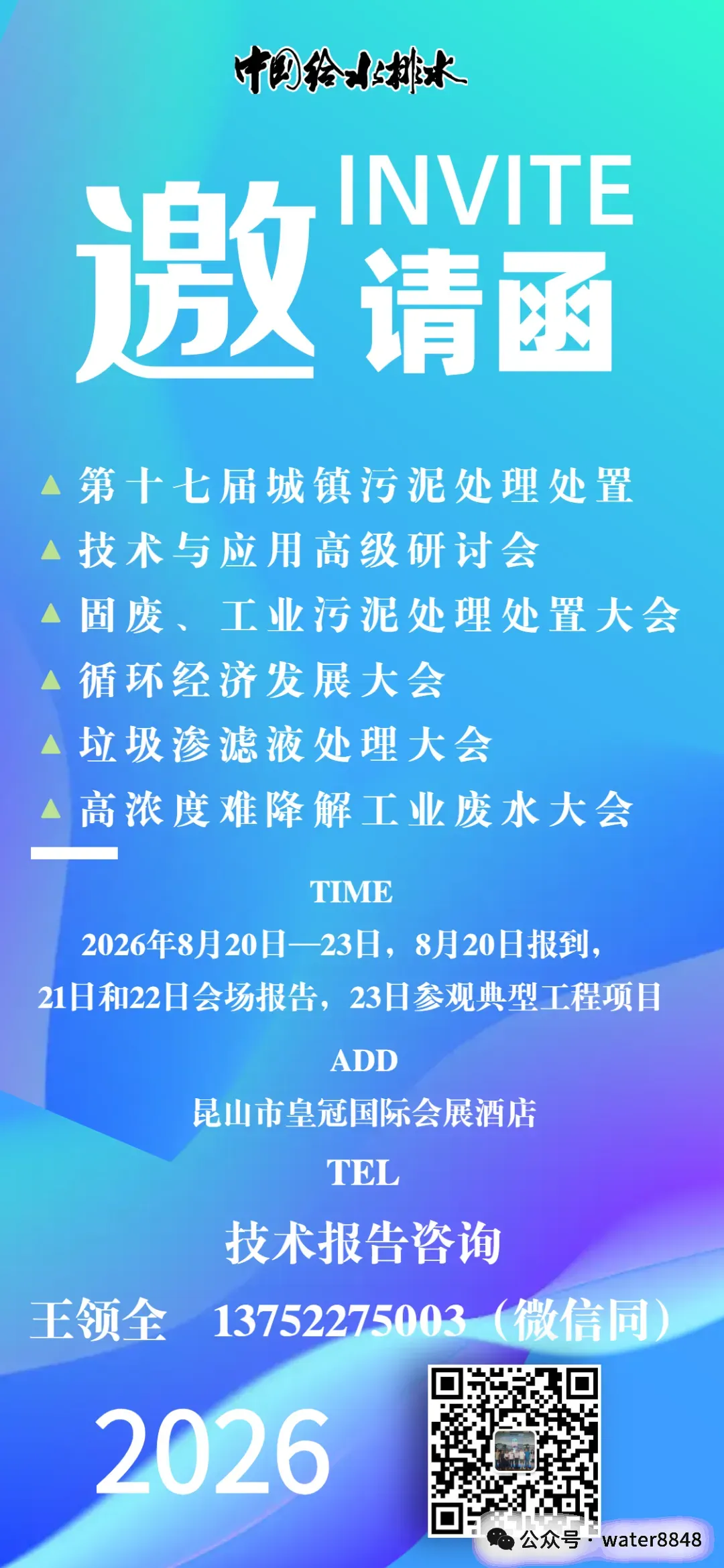 中国给水排水2026年污泥大会(第十七届)邀请函(同期召开固废大会、工业污泥大会、渗滤液大会、高浓度难降解工业废水处理大会)共创、共生、共赢--鼎力打造中国污泥处理处置核心品牌生态圈 时间:2026年8月20日—23日 ,8月20日全天报到,21日—22日会场报告,23日典型项目参观 会场酒店:昆山皇冠国际会展酒店(江苏省昆山市前进西路1277号)