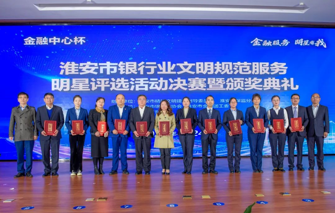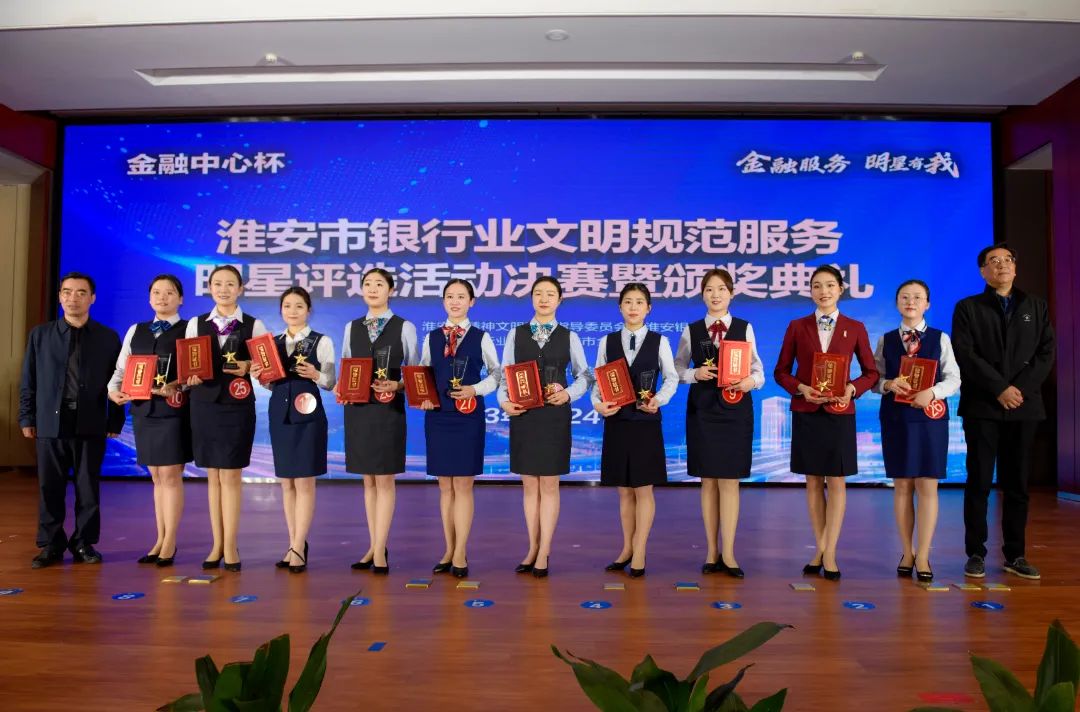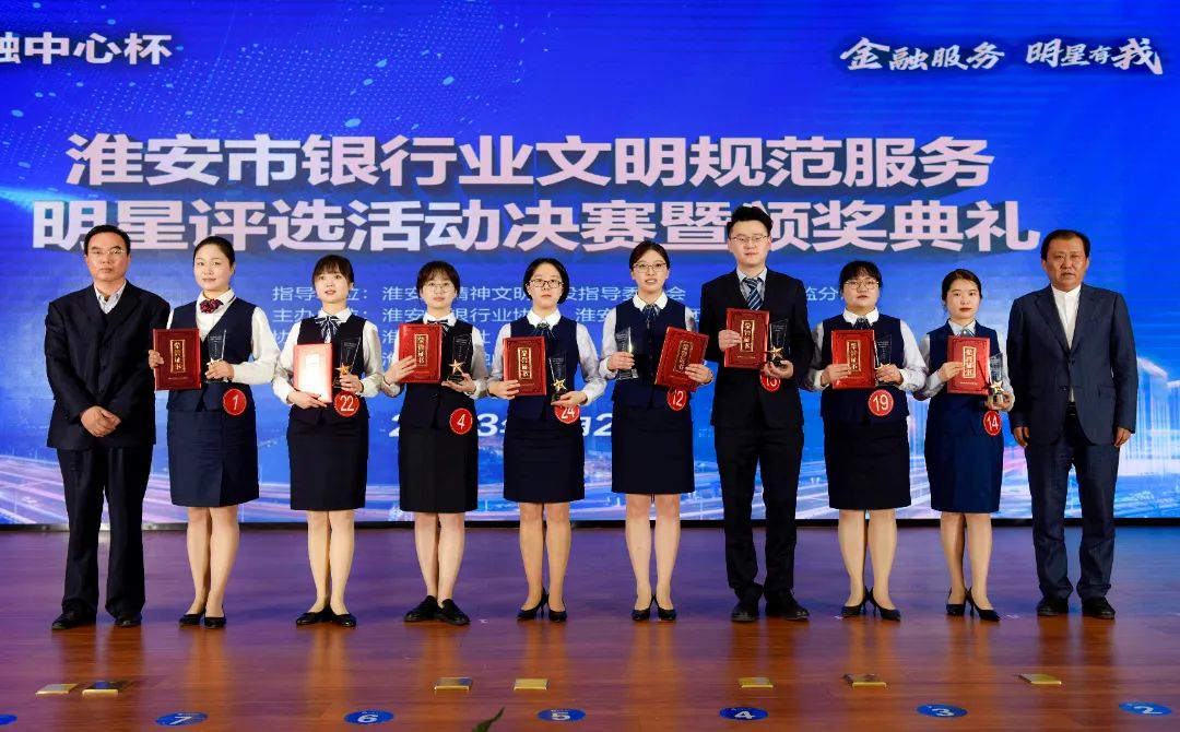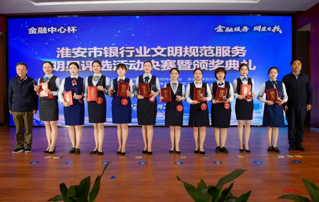进入决赛的选手,在江苏银行淮安分行决赛现场,通过礼仪展示、情景演练、脱口秀三轮角逐,江苏银行淮安分行张明玥、工商银行淮安分行张婷、光大银行淮安分行宋祖薇、农业银行淮安分行胡诗梦、交通银行淮安分行郑文慧、农业银行淮安分行濮迎亚、淮安农村商业银行刘思忆、江南农商行淮安分行王昕、兴业银行淮安分行伍萌萌、交通银行淮安分行蒋达晶10位选手获“2022年淮安市银行业文明规范金牌服务明星”;农业银行淮安分行谷颖、交通银行淮安分行吴瑶、涟水农村商业银行蒋梦颖、交通银行淮安分行李昀书、盱眙农村商业银行陈馨、涟水农村商业银行施佳云、中国银行淮安分行严玲、中国银行淮安分行黄欣佳、金湖民泰村镇银行赵雯艳、金湖农村商业银行董薇10位选手获“2022年淮安市银行业文明规范银牌服务明星”;海安农商行盱眙支行董菲菲、清浦兴福村镇银行沈敏、清浦兴福村镇银行孙欣、洪泽农村商业银行焦艳、洪泽农村商业银行颜珺、涟水农村商业银行徐梦宁、洪泽农村商业银行朱珠、金湖农村商业银行杨倩8位选手获“2022年淮安市银行业文明规范优秀服务明星”。工商银行淮安分行、农业银行淮安分行、中国银行淮安分行、交通银行淮安分行、兴业银行淮安分行、光大银行淮安分行、江苏银行淮安分行、淮安农村商业银行、涟水农村商业银行、洪泽农村商业银行、清浦兴福村镇银行、江南农商行淮安分行荣获“优秀组织奖”。