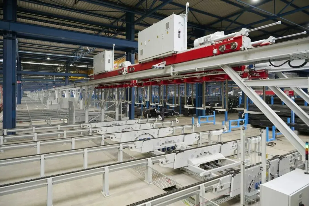 访客站在轻盈的玻璃幕墙前,视线完整可以看到长达 315 米的全自动单轨分拣系统,系统正以极高的效率吊起、转运、分拣千吨级的钢管,机械运转的轰鸣隔着玻璃清晰传来。那些原本需要用大段文字、枯燥数据表才能讲清的产能、运力、智能化能力,就此转化为最直白、最有冲击力的视觉触点。