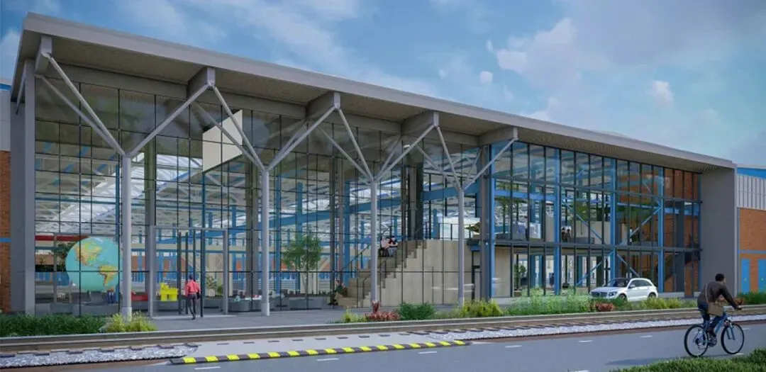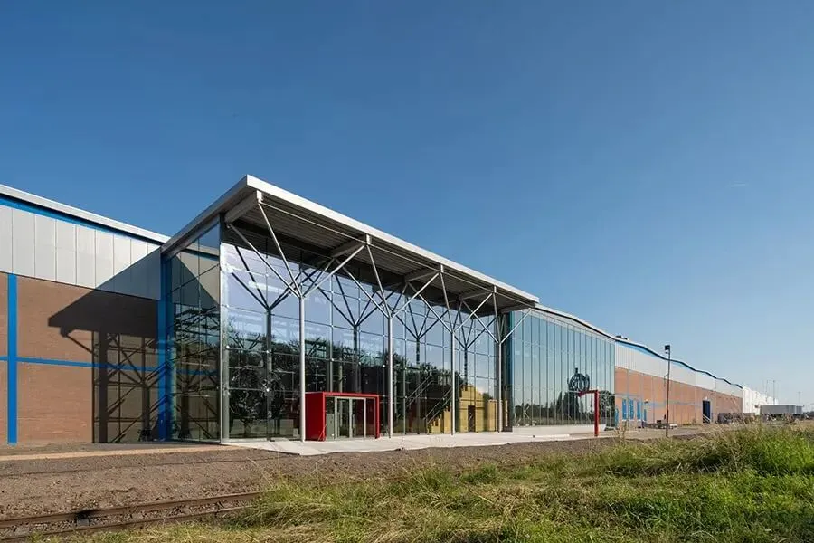 建筑师 Andries Lugten 在总部 85000㎡的巨型仓库转角处,硬生生延伸出一个通体透明的玻璃玻璃体块,用全透明的幕墙,把日夜运转的智能仓库、自动化分拣系统,完整地编入了百年展的叙事主线中。