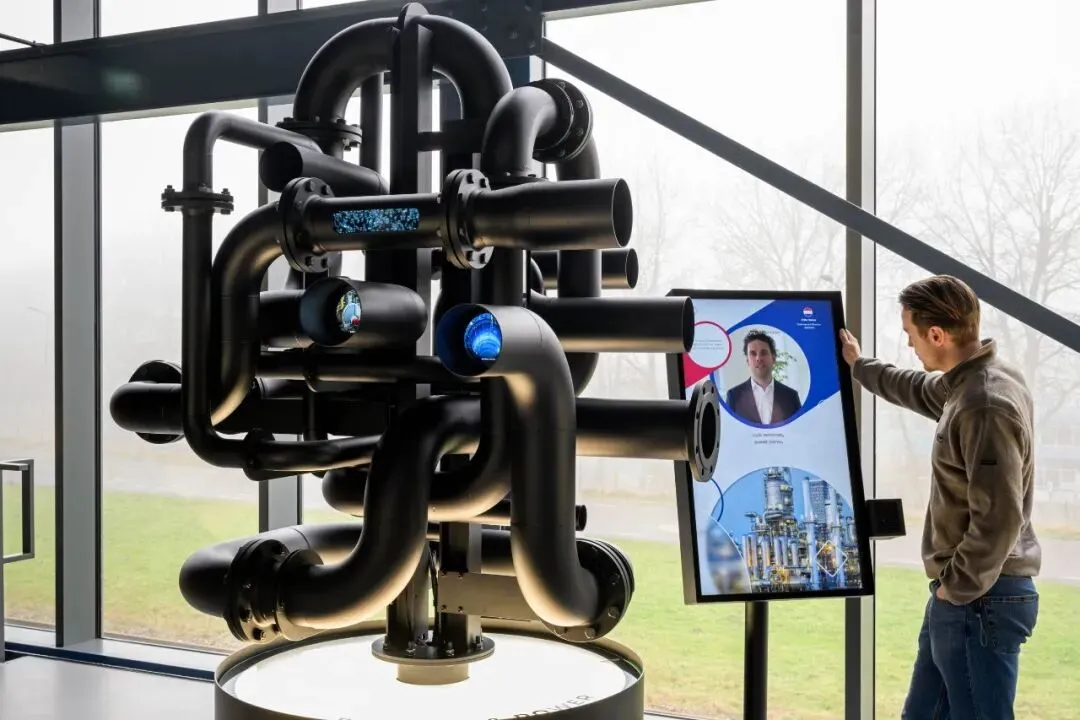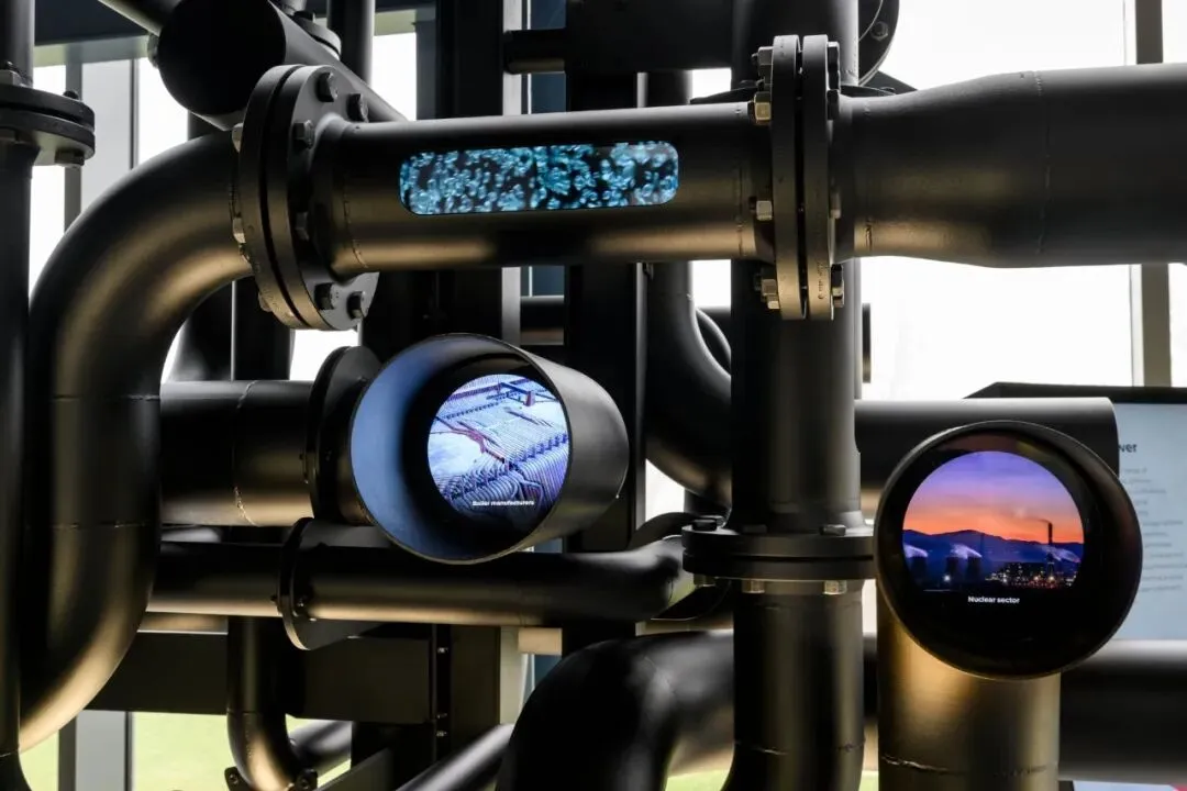 空间的核心亮点之一,是佩珀尔幻象全息技术打造的互动装置。物理管材静静悬垂于空间中,数字幻影在周遭流动,访客只需简单互动,全息动画就会直观演示:这些看似普通的钢管,如何成为海上风电机的深海基座、现代农业温室的支撑骨架、高层建筑的核心结构、城市地下管网的主动脉,如何支撑起跨国能源转型的骨架,如何融入现代生活的每一个角落。