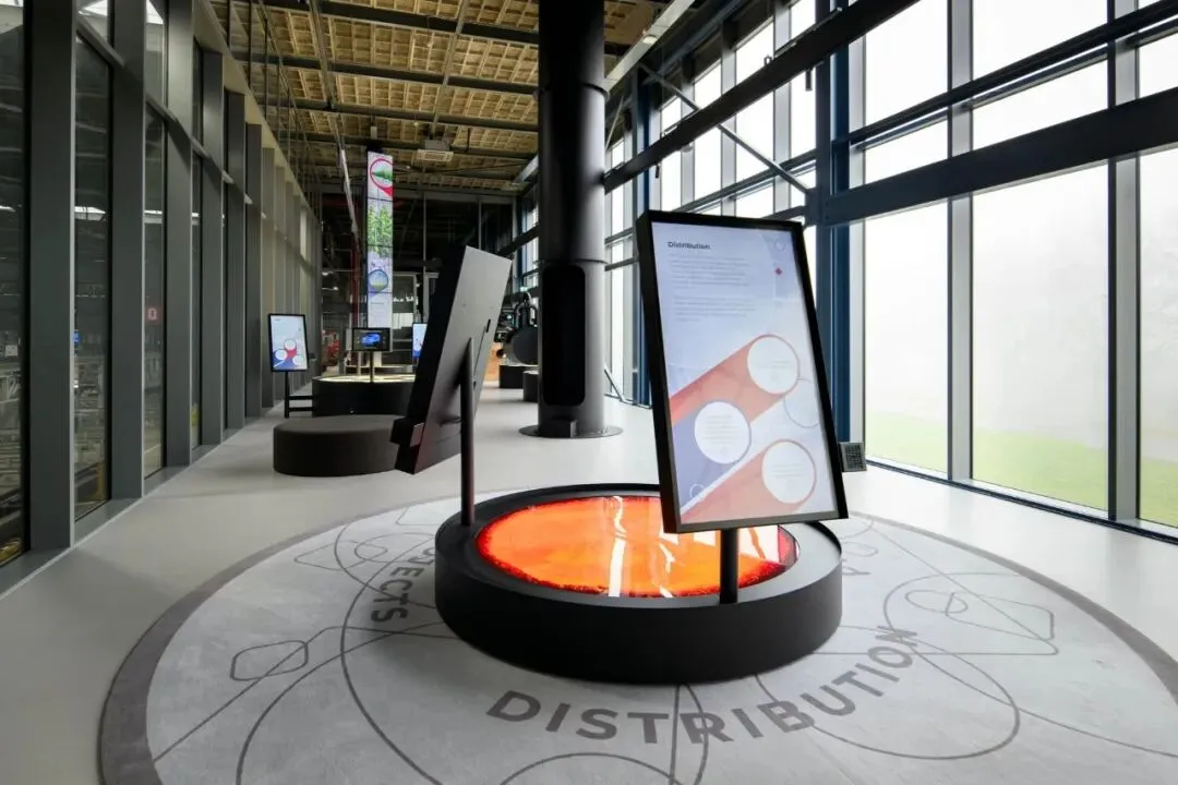 一是依托现有厂区的极简玻璃空间,直观看到工厂,工厂就是展品;二是替代实体展品的轻量化交互,只用轻量化数字交互、全息投影搭配少量物理管材,就讲透了品牌核心价值,不仅前期制作成本远低于实体展项,后期内容迭代也无需改动硬装,维护成本更低、灵活性更强。