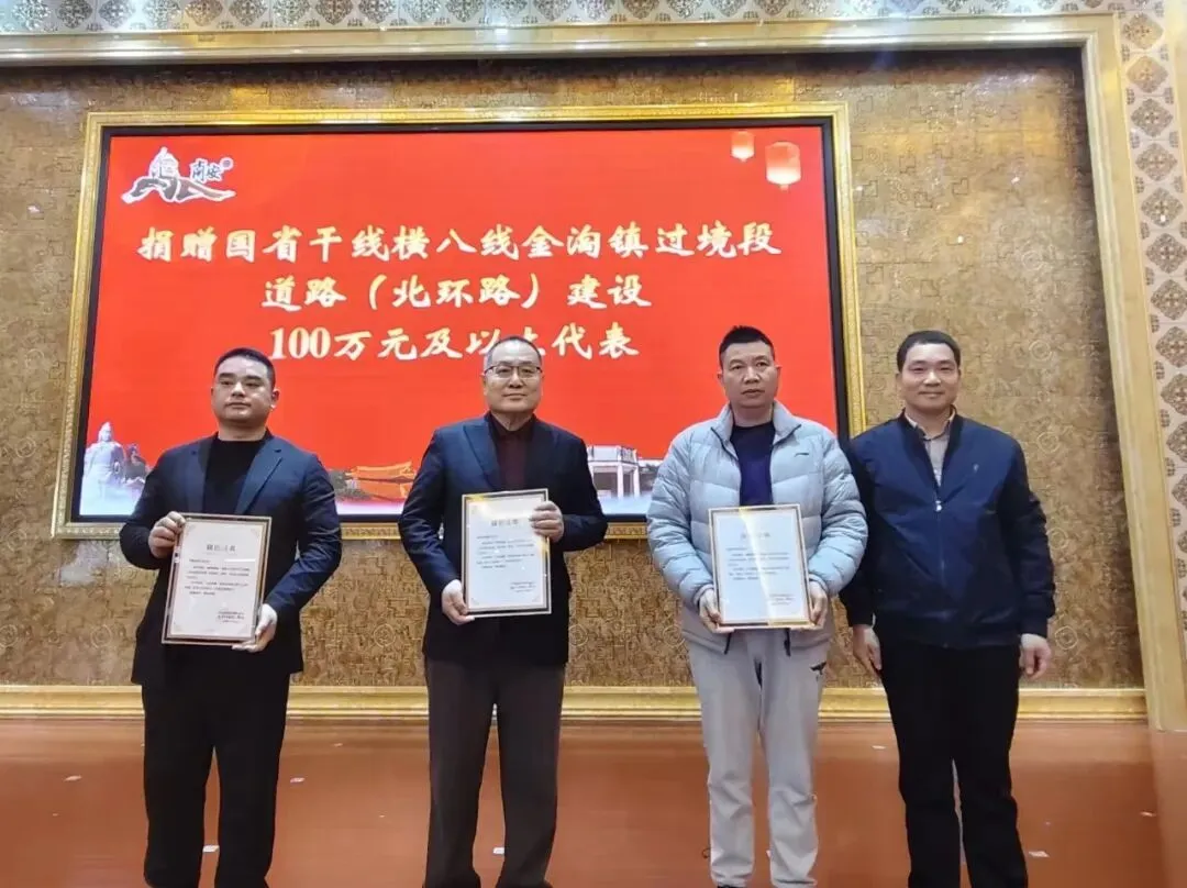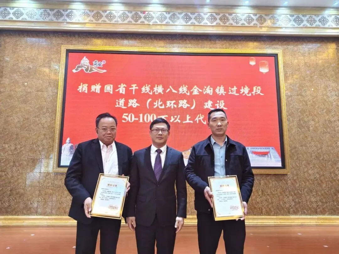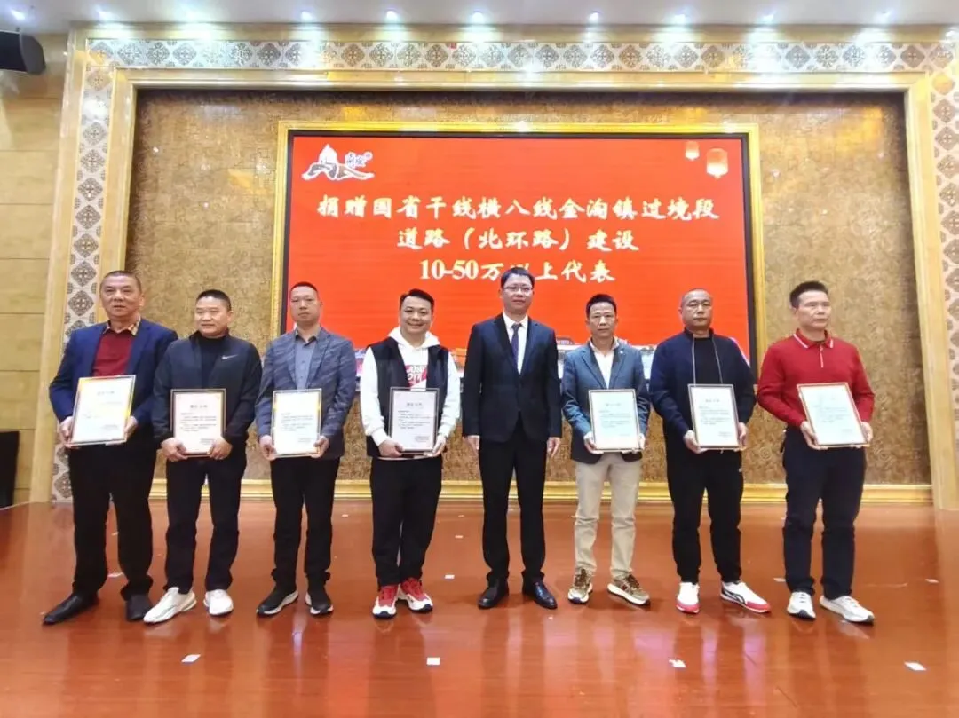 刘高克、黄俊加、傅成顺为横八线项目捐资十万元以上贤达代表颁发证书。