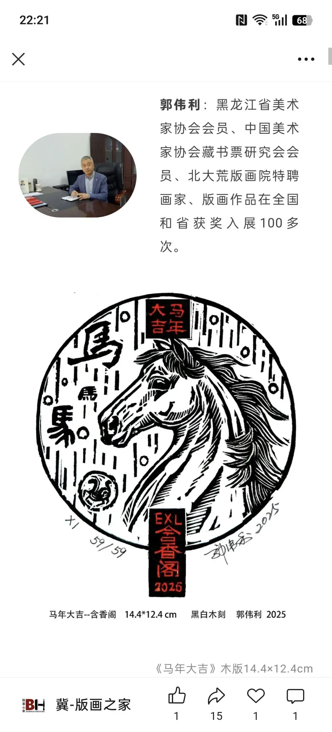 【线上展览】河北省美术家协会版画艺委会马年献瑞一2026马年贺新春生肖版画展.郭伟利藏书票《马年大吉》入展.