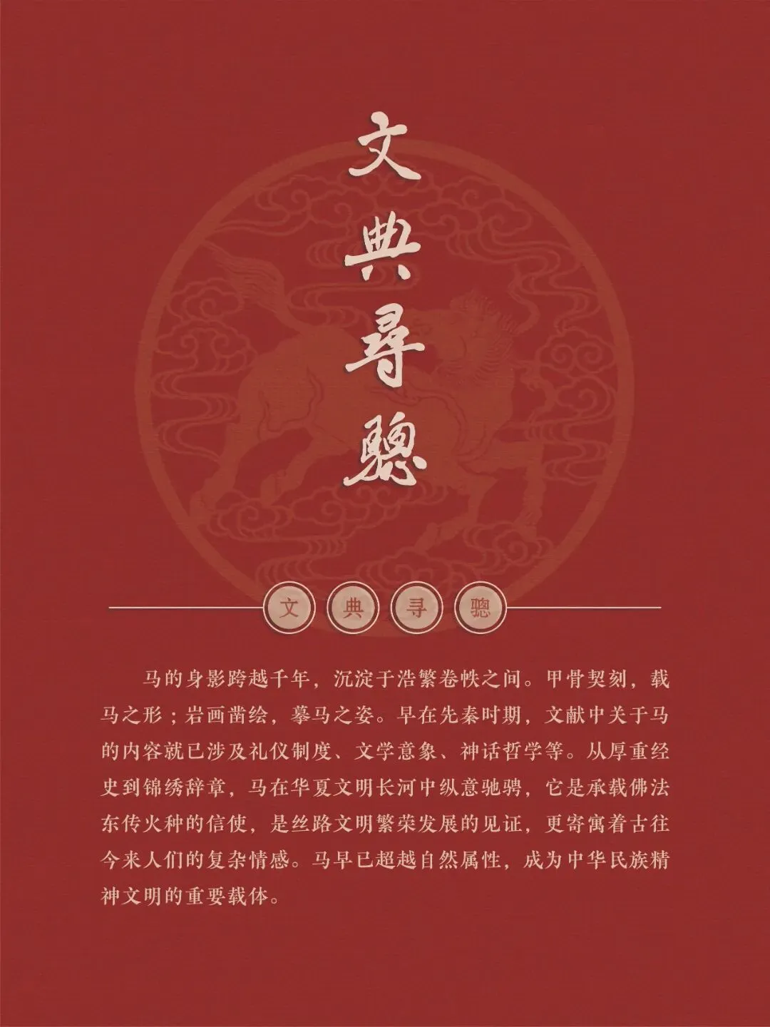 “五马如飞龙,青丝结金络。”马,自古便是人类不可或缺的伙伴。从神话传说中的祥瑞灵物到诗词歌赋里的常见意象,从战场上的骁勇善战到田野间的勤恳劳作,从古画里的俊美矫健到典籍中的笔墨印记,在漫长的历史长河中,马早已超越单纯的工具属性,成为自由和吉祥的化身,成为坚毅和奋进的象征,成为中华民族乃至全人类精神图谱中的鲜活符号。