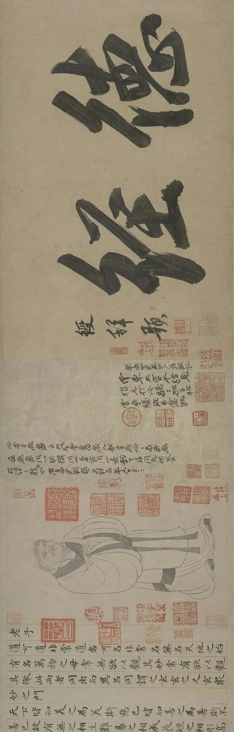 引首有姚绶题“松雪书道德经”,经文前有赵孟頫绘老子像,人物面目安详,线条自然流畅,可谓形神具备,前隔水有张大千题记二则。