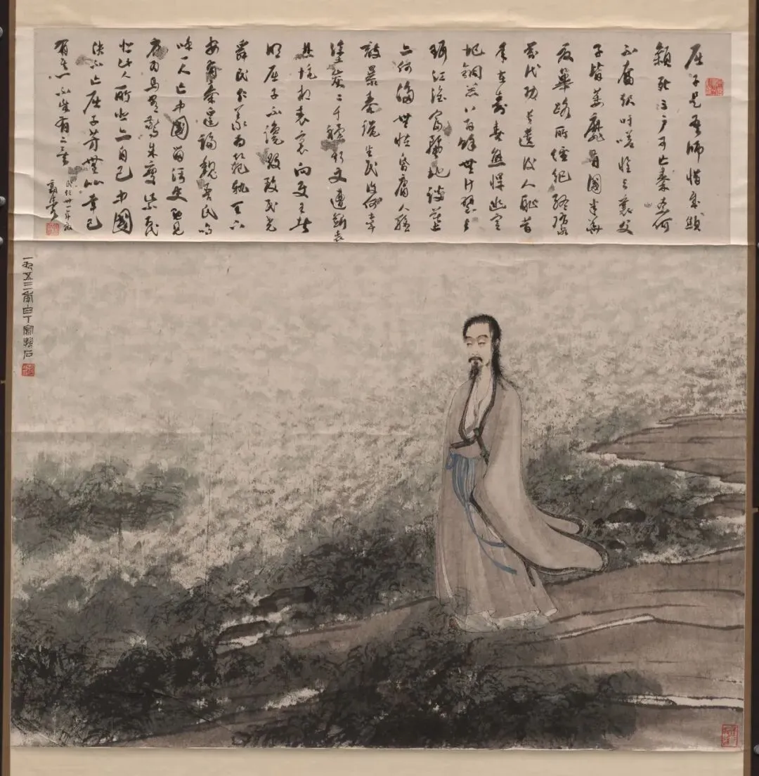 此图据楚辞《渔父》中所描述之屈原,“游于江潭,行吟泽畔,颜色憔悴,形容枯槁”的形象而画。是“披发行吟”投江自沉之前的形象。背景汨罗江水滔滔,泽畔草木莽莽,烘托出悲壮的气氛。屈原不仅枯槁憔悴,且眉目凄切,愁容惨淡,更见其内心之深沉悲愤。