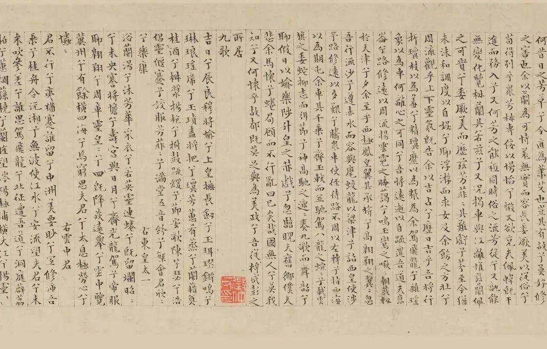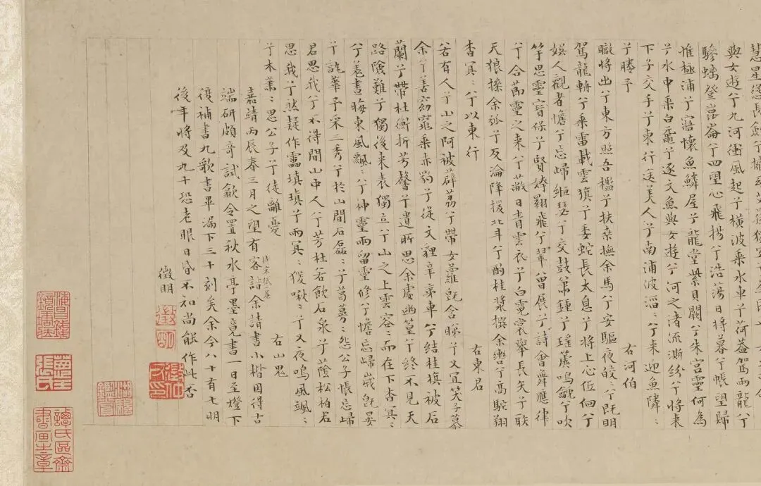 作者款识:嘉靖丙辰春三月之望,有客持宋纸一卷。诣余请书小楷。因得古端研颇奇,试歙令置秋水亭墨,竟书一日至灯下。复补书九歌,书毕漏下三十刻矣。余今八十有七,明后年将及九十。恐老眼日昏,不知赏能作此否?徵明。