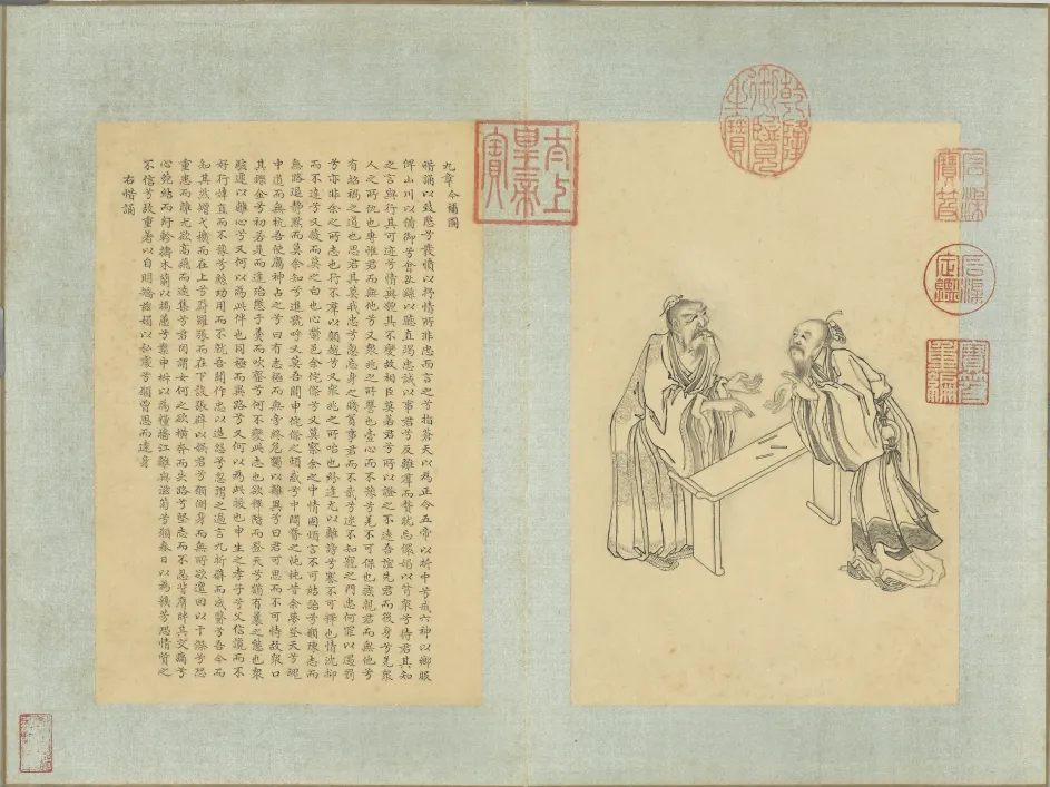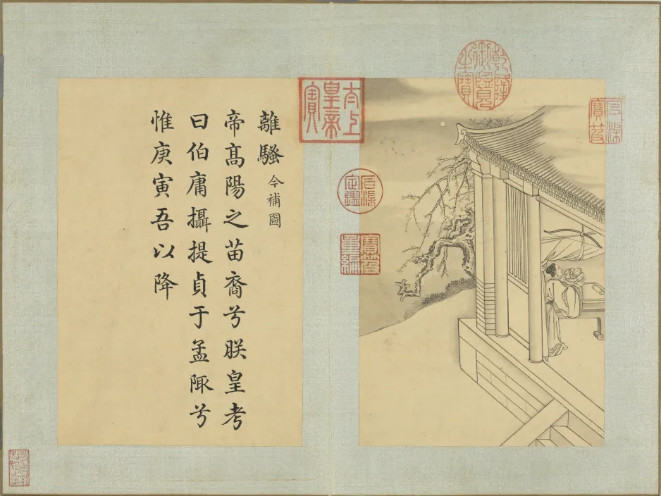 乾隆皇帝组织编修《四库全书》时,发现收录的萧云从《离骚图》已有残缺,且仅描绘了部分篇章。为成就一部完璧,他特命画院画家门应兆在萧本基础上进行补绘。因此,这件作品融合了萧云从原画的奇崛构图与门应兆严谨精丽的宫廷画风,最终完成了对《离骚》、《九歌》、《天问》等全部篇章的视觉化诠释,具有极高的艺术与文献价值。
