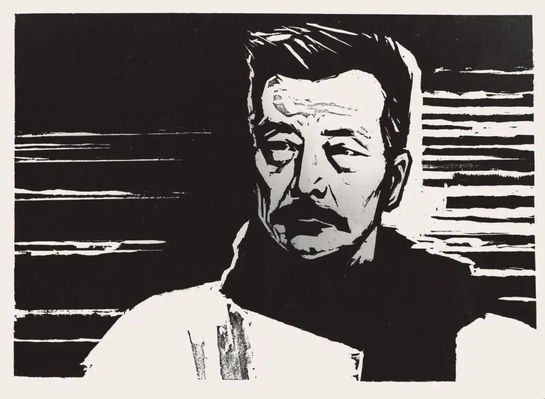 《鲁迅像》是赵延年60年代初代表性的木刻肖像。犀利的刀法,强烈的黑白,简洁的构图,刻画出鲁迅“横眉冷对千夫指,俯首甘为孺子牛”的人格。作者采用独创的透印法,在拓印过程中有意地将衣褶与额纹淡化处理,使作品在强烈对比中富有层次与虚实。整幅作品几乎只用一把斜刀刻出,气韵贯通,一气呵成,无刻意雕凿之弊。
