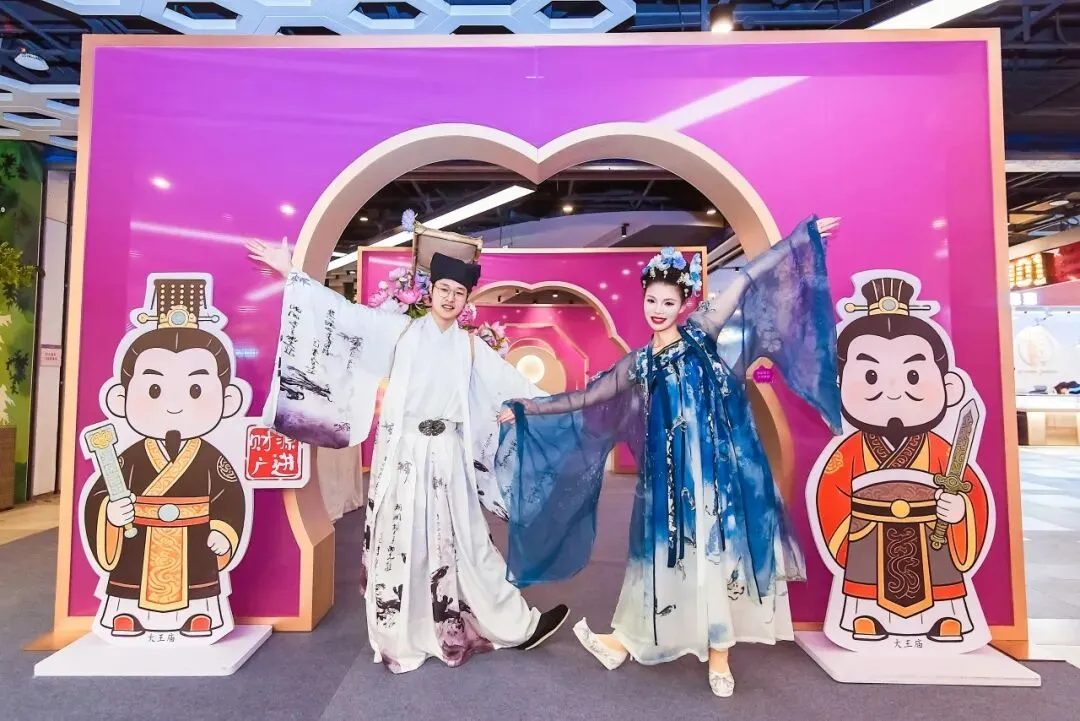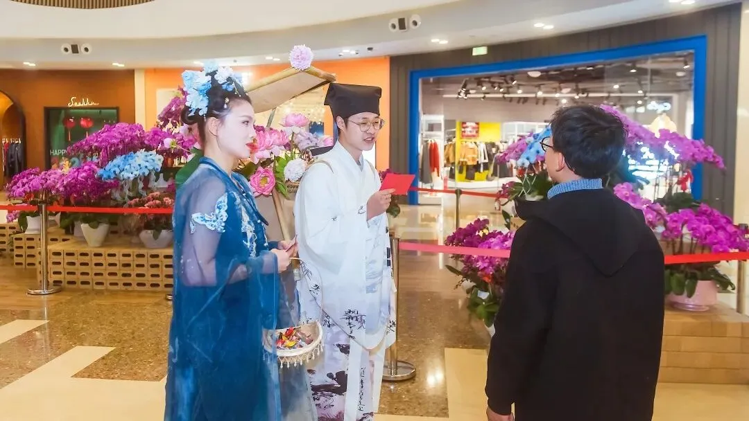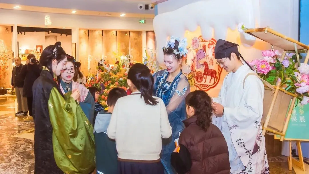 三楼“兰雅连廊”精品区,国风NPC互动巡游刚巧经过:身着汉服的“兰花仙子”提着花灯款款而行,挑着扁担的“卖货郎”吆喝着“兰花文创,新春特惠”,瞬间把现场氛围拉满。“刚才和‘卖货郎’对了句兰花诗,还赢了个兰花香囊!”大学生小苏晃着手里的奖品,脸上满是笑意,“这种沉浸式互动,比单纯看展有意思多了。”