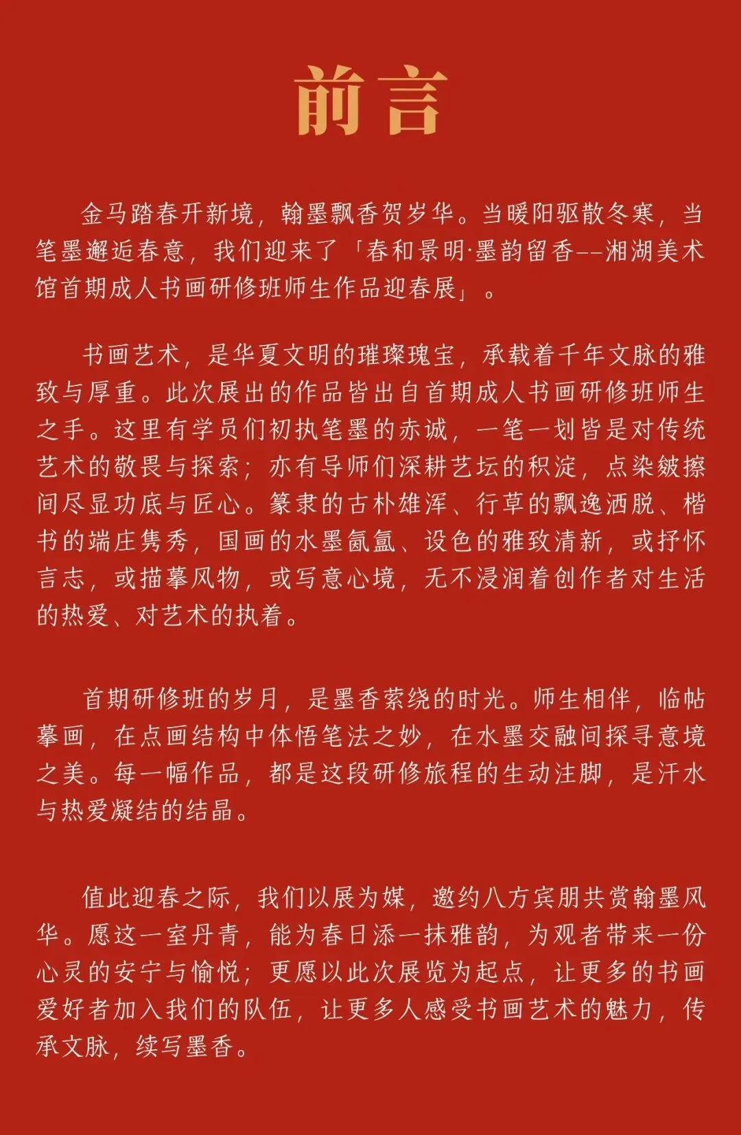 “春和景明·墨韵留香——湘湖美术馆首期成人书画研修班师生作品迎春展”自开展以来,得到了社会各界的广泛关注与热烈好评。展览不仅展示了研修班师生的丰富教学成果,更在新春佳节,与广大市民朋友共赴了一场美好的艺术之约。
