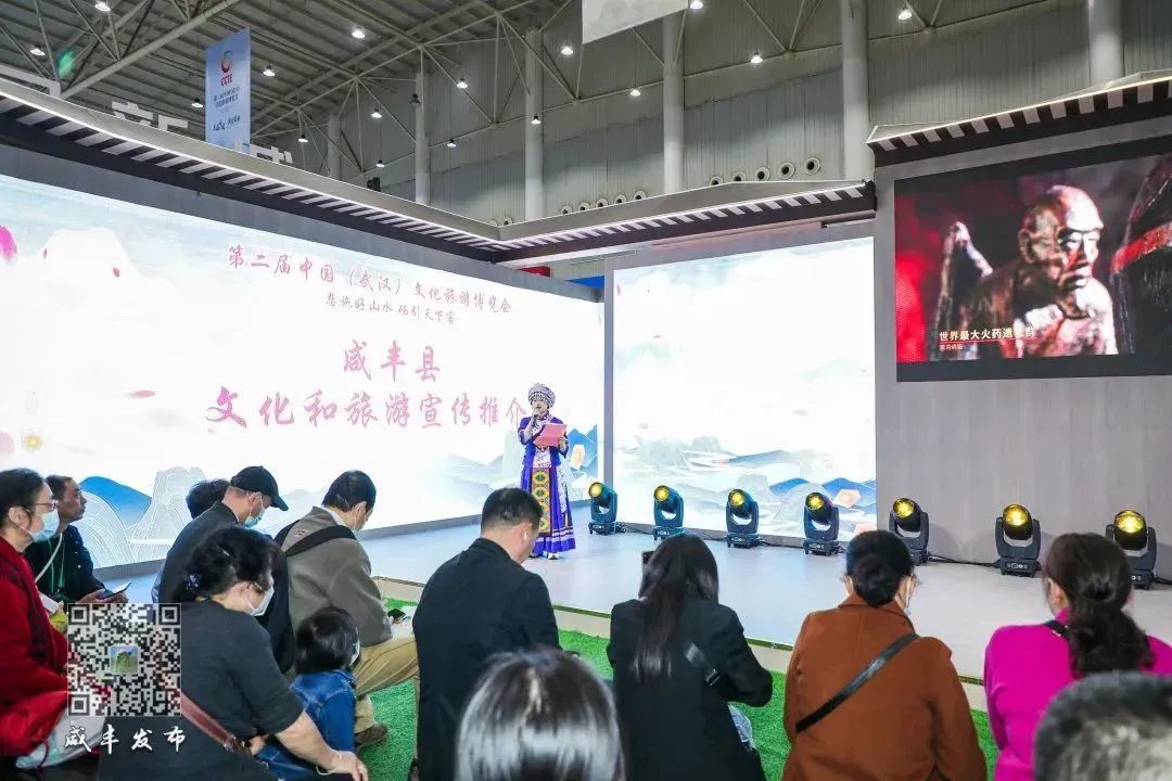 恩旅集团咸丰板块旅游推介代表为游客们推介咸丰三大景区——坪坝营景区、唐崖土司城遗址景区、唐崖河景区,诚邀游客们来咸丰·庆丰年。