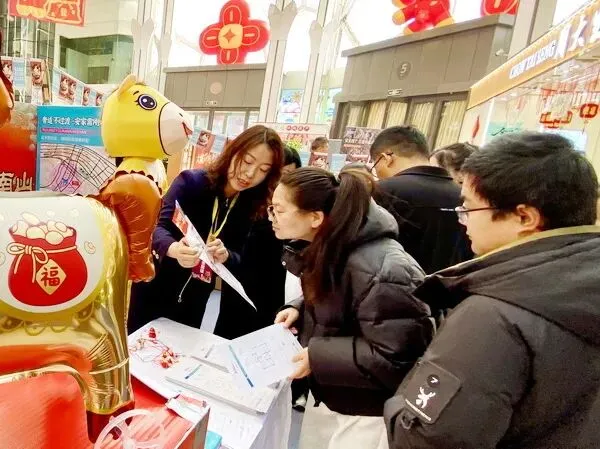 上午10时许,唐道·637商业广场一楼大厅已是一派热闹景象。伴随着欢快的新春乐曲,市民们携家带口涌入会场,不少春节期间来青旅游的外地游客也被热闹的氛围吸引,驻足咨询。在各个楼盘展位前,置业顾问们热情地介绍着项目亮点、户型特点和避暑优势,整个现场洋溢着喜庆祥和的节日氛围。