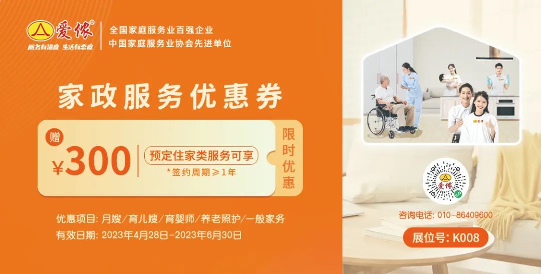 首届全国家政博览会以“大家政、新市场、僖生活、福产业”为主题,重点围绕家政服务场景、社区便民服务、员工制企业、养老产业、育婴童、医疗护理、家政产业融合等内容开展展览展示、论坛交流、经验分享、成果发布、双创大赛、互动体验等系列活动。届时来自30余个省(市、自治区)的50余个城(区)以及58同城、轻喜到家、天鹅到家、51管家等300余家知名企业,多个地方城市组团和家政相关企业机构代表参加。爱侬也将作为家政企业代表亮相展会,展位号K008。