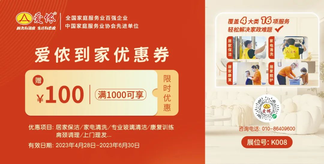 首届全国家政博览会期间,爱侬推出专属优惠活动——爱侬到家小程序充值满1000赠100!可通过小程序预约十余种到家服务,足不出户即可享受专业优质的家政服务!