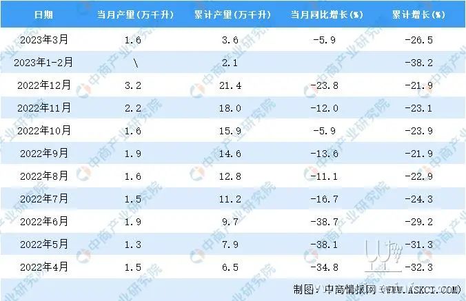 据中商产业研究院数据库显示,2023年3月全国葡萄酒当月产量与去年同期相比下降。2023年3月全国葡萄酒产量为1.6万千升,同比下降5.9%。2023年1-3月全国葡萄酒产量3.6万千升,同比下降26.5%。