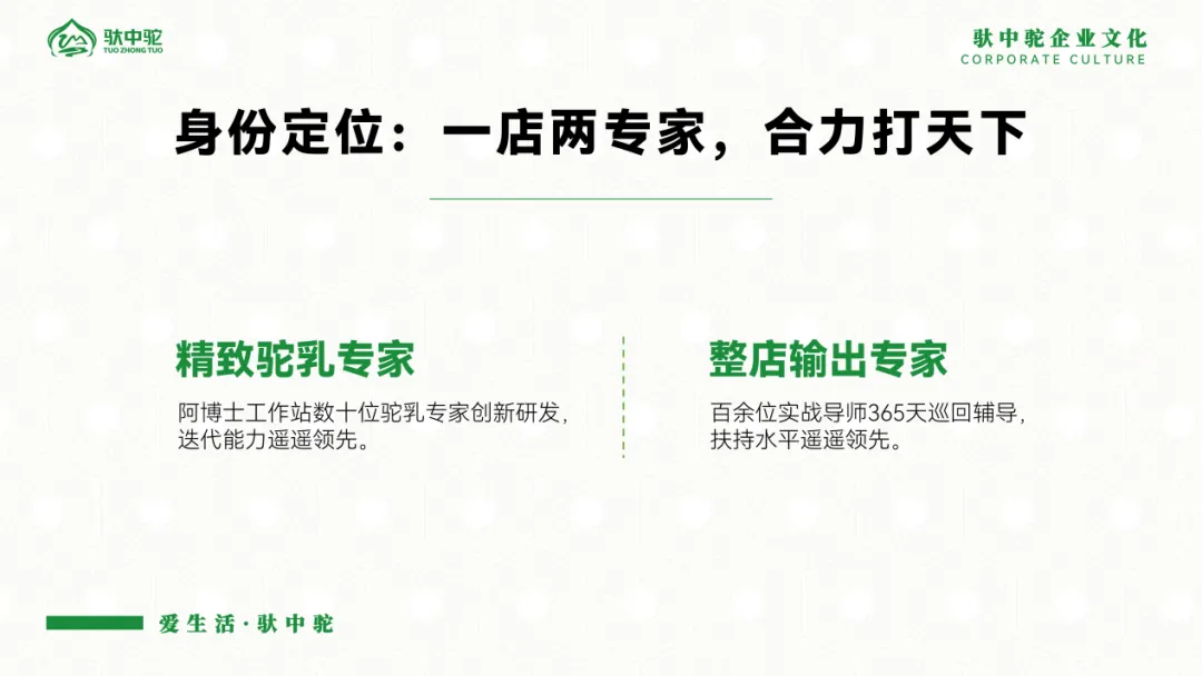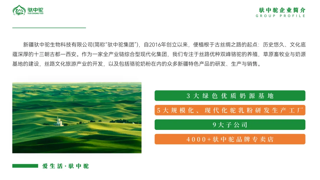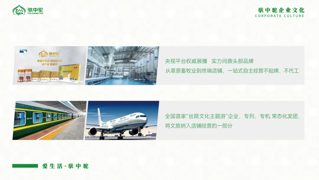 在全民健康意识觉醒的时代浪潮中,驮中驼凭借"科技赋能传统乳业"的创新理念,正在重新定义特色乳制品的价值坐标。对于加盟商而言,这不仅是一个商业项目,更是参与国民健康工程的历史机遇。通过共享品牌势能、产品矩阵与运营体系,每位合作伙伴都将获得持续的增长动能与稳定的投资回报。现在加入,让我们共同书写大健康产业的下一个宏伟篇章!