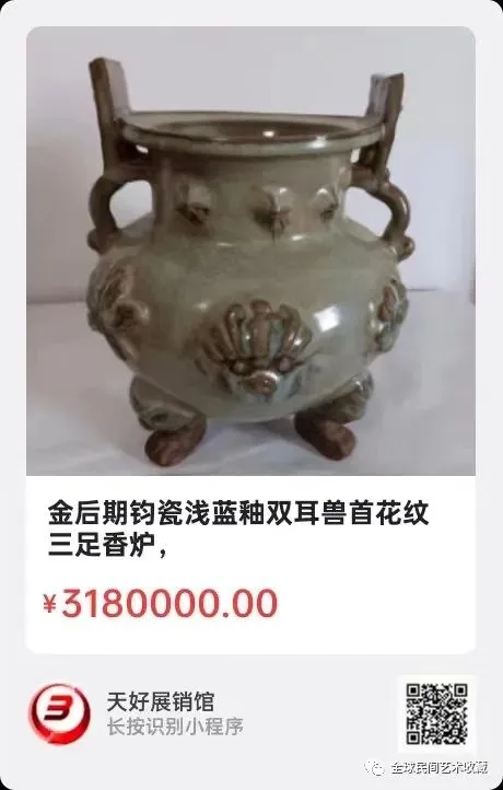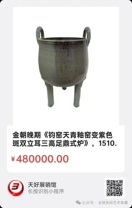 金朝晚期《钧窑天青釉窑变紫色斑双立耳三高足鼎式炉》,高38.3㎝,口径17.5㎝,足矩11㎝。简介:金代陶瓷继承北宋钧窑烧瓷技术,用于礼仪与生活用品生产,工艺虽不算精湛,但器型优美,圈口宽腹底,天青釉色,浓郁鲜亮,局部窑变显淡紫色斑,自然艳美。做为祭祀祈福用香炉,又设计制成了高足鼎式,雍容肃穆,当人们敬天祭祖、香烟了绕时,彰显了皇权或儒教传统文化习俗,如“焚香礼进士,彻慕待经生,教化子民以礼教”!来源1510.V.