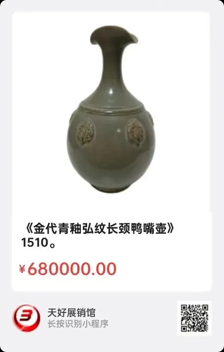 《金代青釉弘纹长颈鸭嘴壶》,高29.8㎝,扁流口9X5.4㎝,底径9.9㎝,腹宽17.5㎝。简介:上述金代青釉长颈鸭嘴壶,是当时游牧文化与农耕文化融合的瓷器造型,可用于饮酒,饮水,净手之用,突出了马上生活的特点。此瓷器胎质坚致,青灰胎质含铁高,釉色橄榄青泛黄,滢润,有光泽,釉色匀净。壶肩有贴花,圈足切削垫烧,胎体干老。壶长颈口扁鸭嘴型,两头流口,突显粗犷的草原文化。该古陶瓷壶是中国北方游牧民族特色实用器物,留存至今属稀见器型门类!非常具有历史研究与收藏价值!来源1510.V.