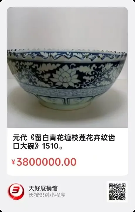 元代《留白青花缠枝莲花卉纹齿口大碗》,高16.3㎝,口径39㎝,底径18㎝。简介:以上元代青花满绘莲纹齿口大碗,是元代晚期烧制的官窑瓷器。大碗撇齿口,深腹,胎底无釉,露火石红胎质。大碗内外滿青花釉彩,纹饰布局疏密有致,大小不同的莲花缠枝图纹绘画,采用留白技艺,美术设计精湛。此瓷器绘画多层次,苏麻离青釉色浓艳,与留白图纹对比,给人以强烈的视觉效果!此瓷器是元代一个典型的宫廷器物,盛装果品祭祀祈福之用,象征着清明圣洁,吉祥如意!来源1510.V.