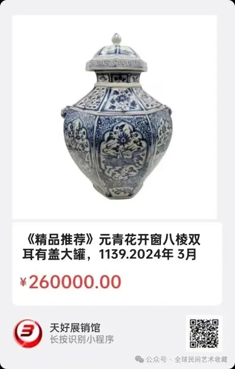 元青花开窗八棱双耳有盖大罐,元青花开窗八棱双耳有盖大罐。共五层纹式。第一层钱币纹。第二层小花纹,第三层八种花卉。第四层主题纹式,有凤凰,瑞兽,鸳鸯戏水。缠技莲纹包围宝莲开窗。第五层是八宝。画功精湛,寓意吉祥,是元代青花精品。尺寸高47口径14底径17,2024年 3月 6日,经天好评审团评审,以7票优势荣登精品榜,获第117期天好海选精品。来源:1139。V.
